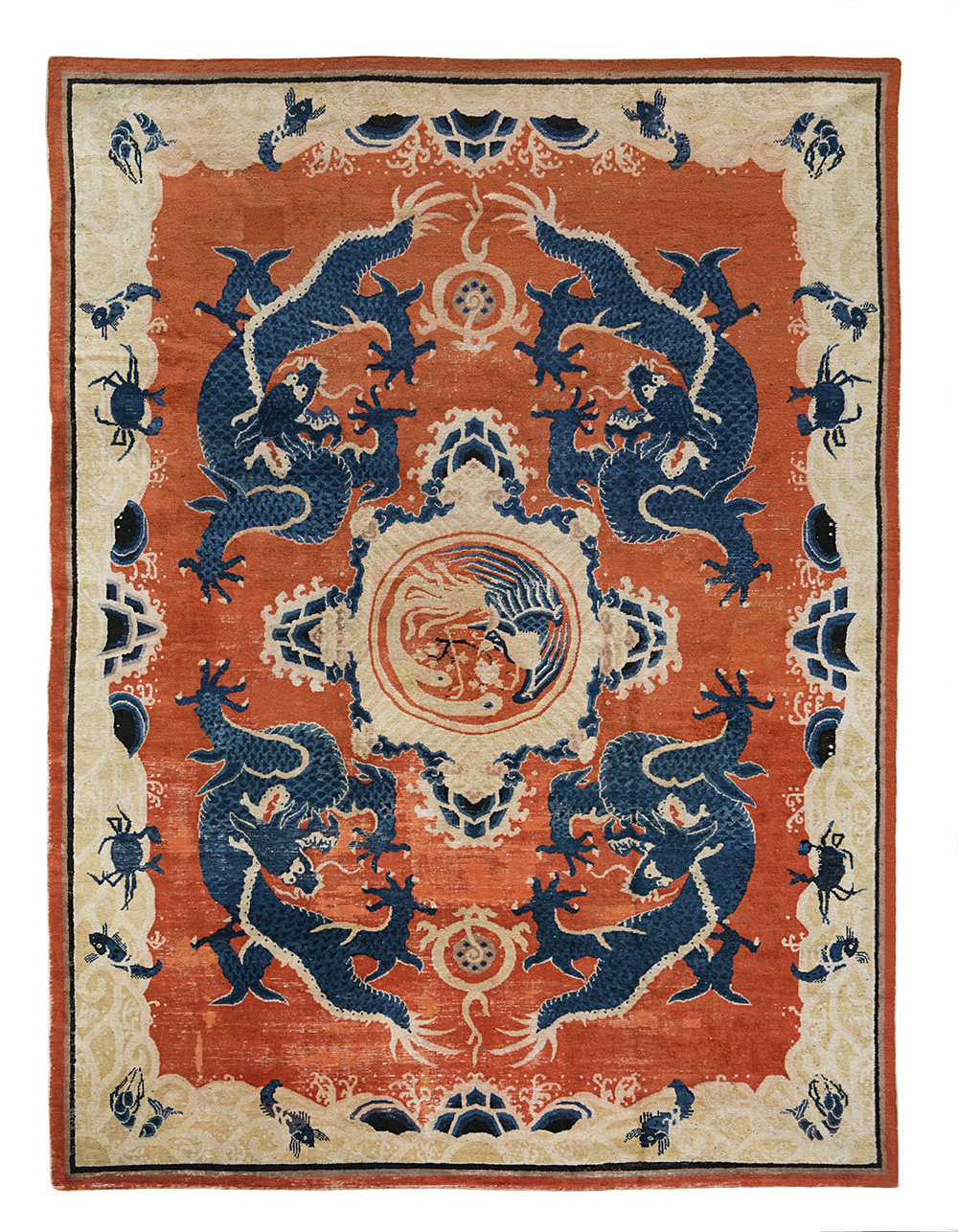 Decoro con quattro grandi draghi speculari e contrapposti in blu e azzurro su campo color corallo. Al centro un medaglione polilobato, con i quattro punti cardinali segno dell'Universalità dell'Impero Cinese, racchiude l'Araba Fenice, simbolo dell'Imperatrice. I draghi, simboli dell'Imperatore, hanno un muso con fauci aperte ed attitudine che esprime potenza e supporto, artigli a cinque dita, sinonimo di alto rango di appartenenza della committenza. Alle due testate la perla dei mille anni contornata dal sacro fuoco dell'immortalità. Rara bordura con Montagna Sacra, pesci e crostacei in azzurro e blu, appoggiati con grazia su onde realizzate in nuance di beige. (cm 374x282) (difetti e restauri)