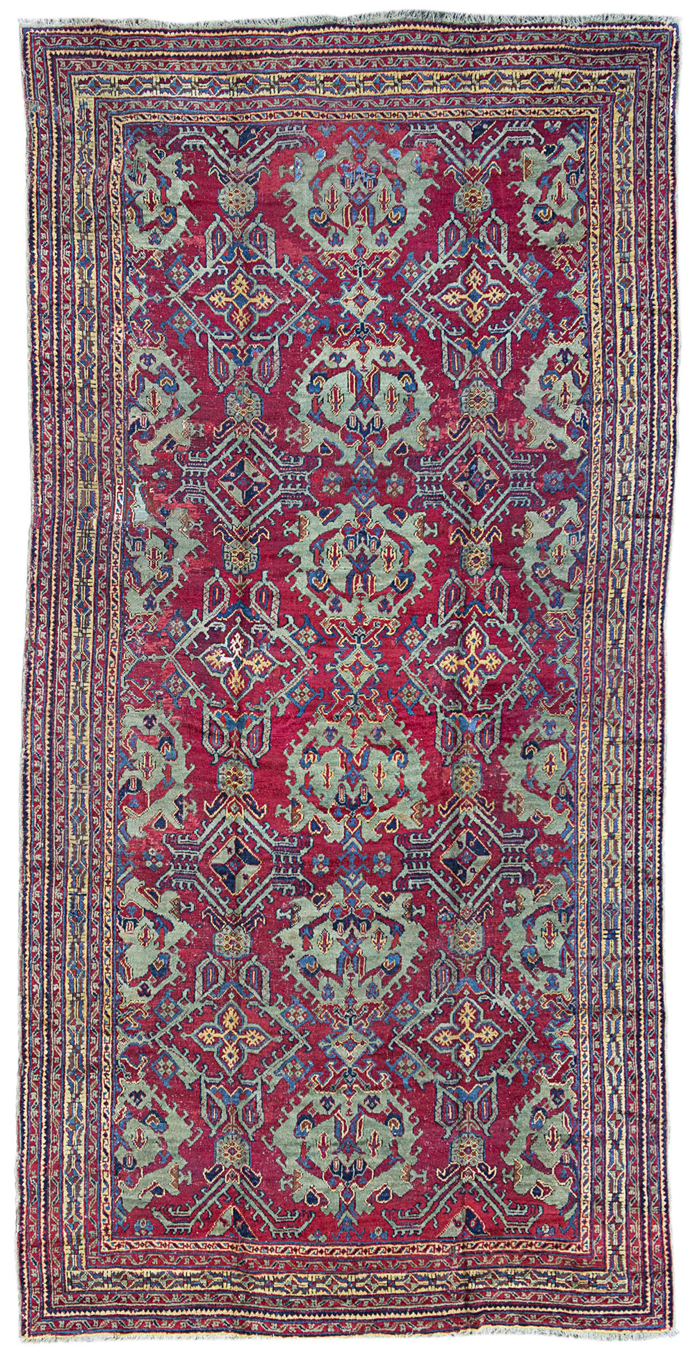 Una bordura ampia con sette cornici, a fondo giallo e rosso, racchiude il campo di questo grande tappeto da palazzo. Decorato da un motivo "all -over" con eleganti medaglioni verde smeraldo, tipici ottomani, ripetuti in file geometriche che si interrompono con la bordura. Il campo è di color rosso rubino. I medaglioni sono intercalati da disegni romboidali nei toni del giallo, azzurro, blu e verde. La decorazione è ricca di piccoli recinti sacri in tonalità contrastanti e motivi geometrici che si riscontrano nelle decorazioni dei tappeti dell'Asia Centrale. (cm 620x346) (difetti e restauri)