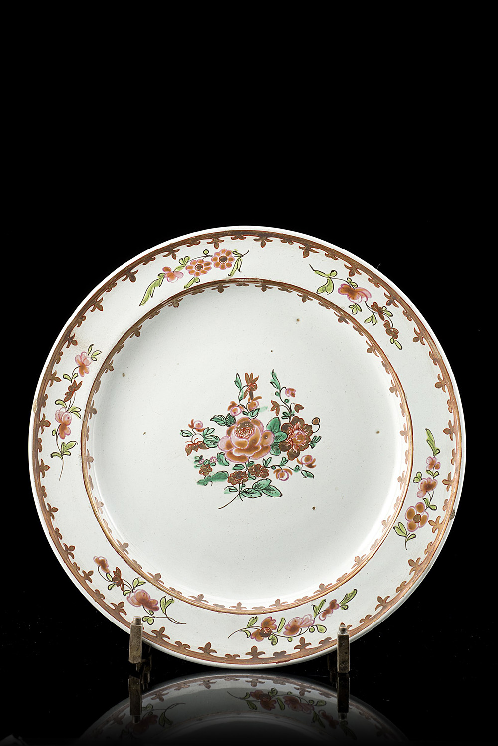 Manifattura di Pasquale Rubati, Milano, 1770/80. Piatto tondo a bordo liscio in maiolica. La cromia è a piccolo fuoco con applicazioni in oro. Lungo il bordo e sulla balza è dipinto un motivo dorato 'a punta di lance'. La decorazione centrale è un mazzo di fiori con rose (d. cm 23,5) (puntinature allo smalto, usure all'oro) Sul retro è presente il cerchio in bruno