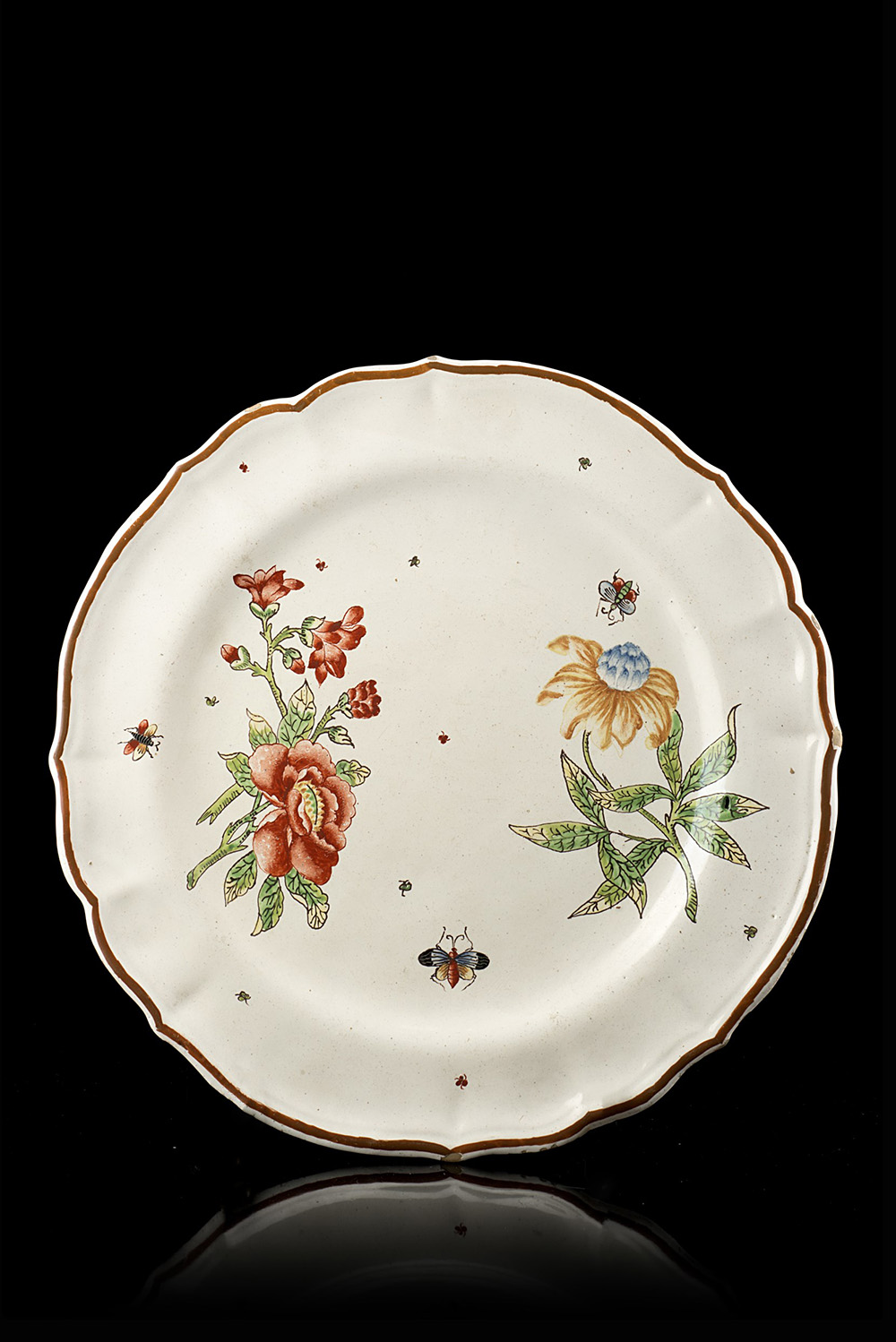 Manifattura di Felice Clerici o Pasquale Rubati, Milano, 1760 circa. Piatto polilobato in maiolica con bordo profilato in bruno. Decorazione a due grandi fiori recisi e farfalle (d. cm. 23,5) (sbeccature)Sul retro sono graffite le lettere iniziali ACO, forse iniziali di possesso.Per confronto si veda: scheda n. 366 a cura di R. Ausenda in 'Musei e Gallerie di Milano - Museo d'Arti Applicate Ceramiche', Tomo II, Electa 2001