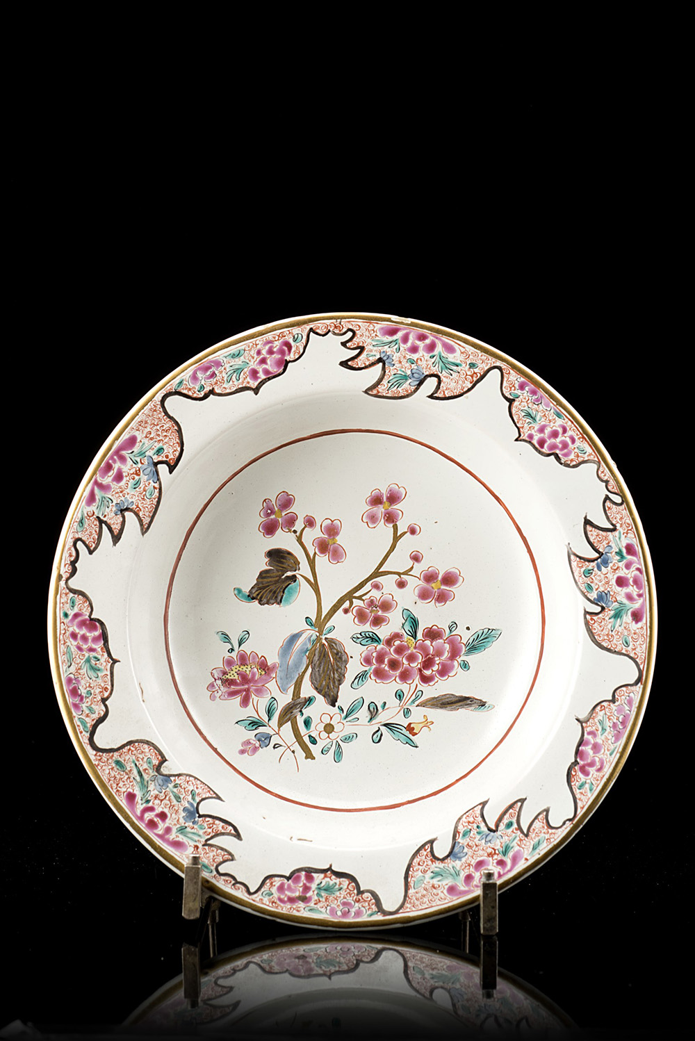 Manifattura di Pasquale Rubati, Milano,1770/80. Piatto tondo in maiolica con decorazione a piccolo fuoco con rialzi in oro. Bordo liscio profilato in oro. Sulla tesa il decoro è costituito da una bordura fortemente mistilinea con ciuffi di fiori su un fondo a piccole spirali. Al centro, profilato da un filo in rosso, un alto ramo con peonie (d. cm 24) (leggere sbeccature e puntinature allo smalto, difetto sul retro)