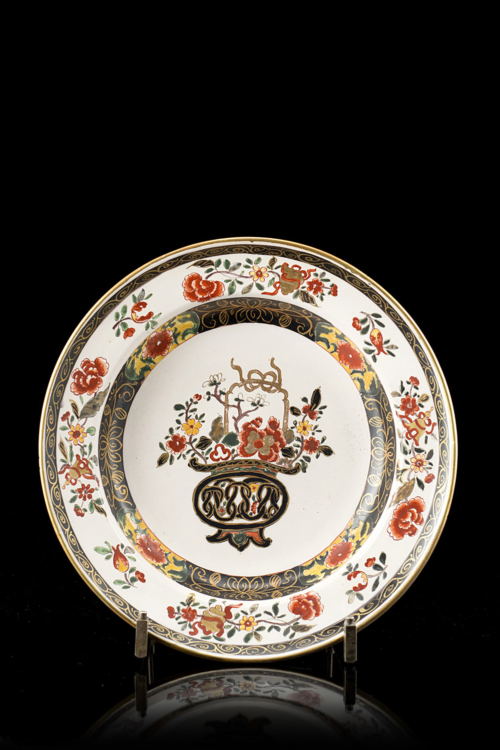 Manifattura di Felice Clerici, Milano, 1770/80. Piatto fondo in maiolica con decorazione a piccolo fuoco e rialzi in oro. Bordo liscio profilato in oro e con un motivo a nastro in nero con piccole spirali in oro; la tesa obliqua e dipinta con gruppi di fiori è rialzata in oro.La balza è decorata con una fascia nera arricchita da dorature e con riserve a fiori. Al centro compare un grande vaso di fiori il cui corpo ovale contiene intrecci di nodi in nero e oro da cui fuoriesce una peonia con fiori (d. cm 22,7) Per confronto si veda: la scheda n. 336 a cura di R. Ausenda in Musei e Gallerie di Milano - Museo d'Arti Applicate Ceramiche, Tomo II, Electa 2001; Saul Levy, 'Maioliche Settecentesche Lombarde e Venete', tav. 1, Gorlich, 1964