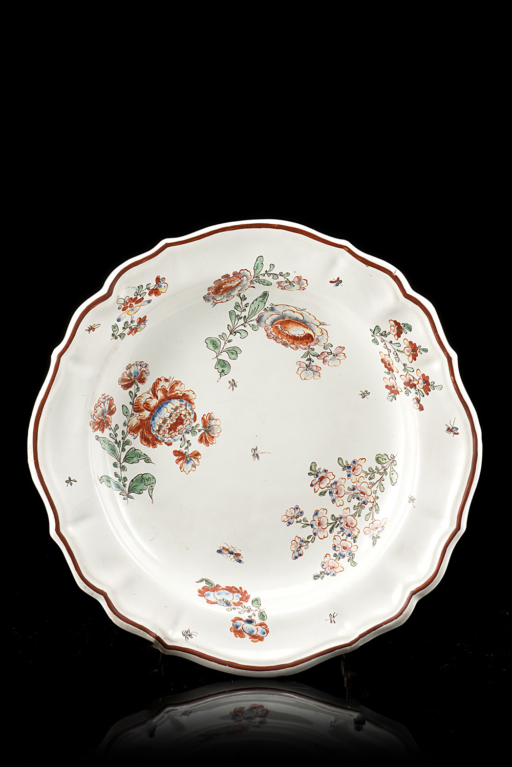 Manifattura di Felice Clerici o Pasquale Rubati, Milano, 1760/70. Piatto a bordo polilobato in maiolica a bordo profilato in rosso bruno. Decorazione a fiori recisi sparsi con piccoli insetti (d. cm 23,8) (lievi difetti)
