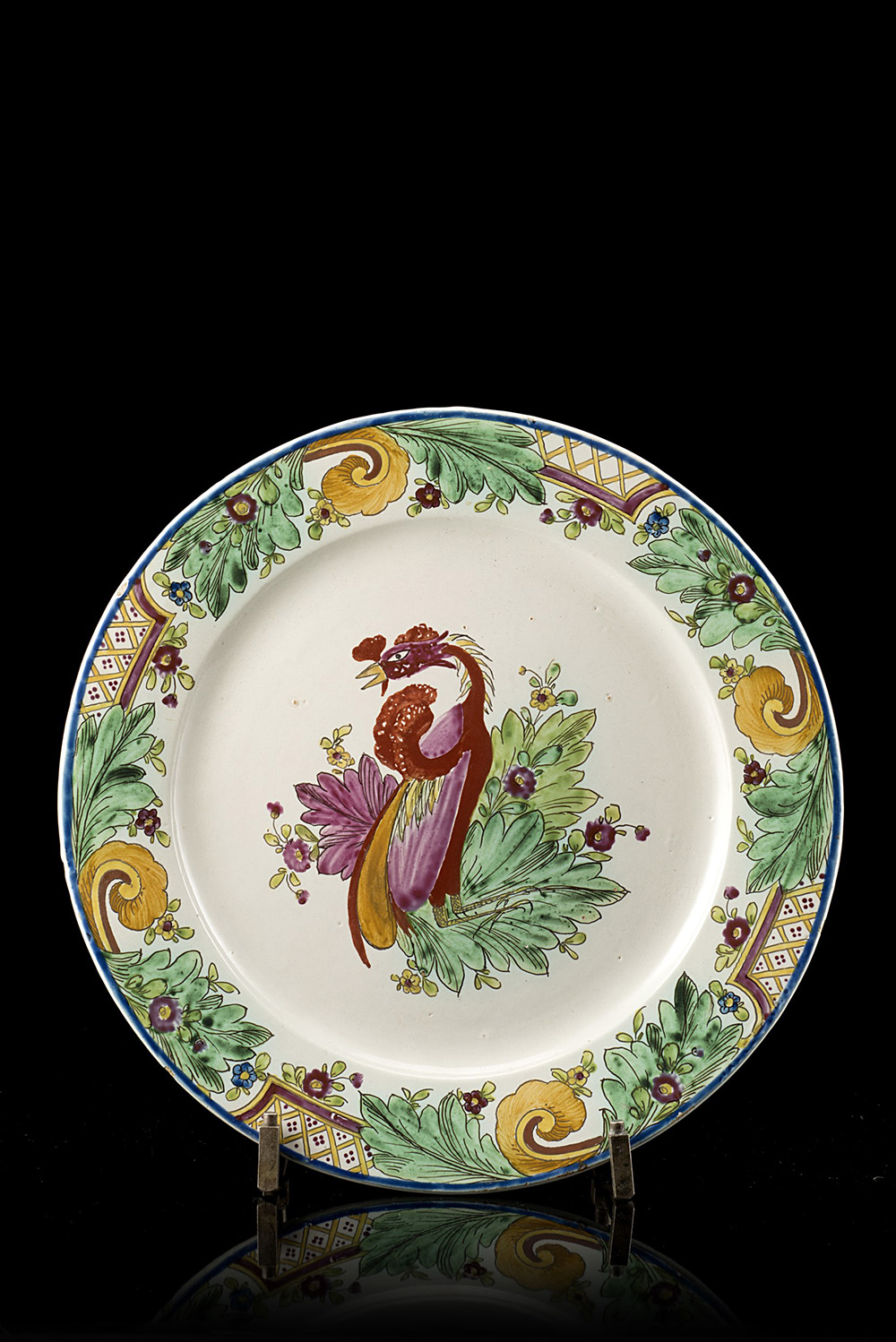 Manifattura di Milano, circa 1760/70. Piatto in maiolica a bordo liscio profilato in blu con decorazione "a foglia di tabacco" a fenice e fiori e nella tesa a rocaille (d. cm 24,5) (lievi sbeccature)Per confronti si veda Saul Levy, 'Maioliche Settecentesche Lombarde e Venete', tav. VI, Gorlich, 1964 (come Felice Clerici); 'Maioliche di Lodi, Milano e Pavia', catalogo della mostra, Museo Poldi Pezzoli, n. 227, a cura di G. Gregorietti, Milano 1964 (come Felice Clerici o Pasquale Rubati)