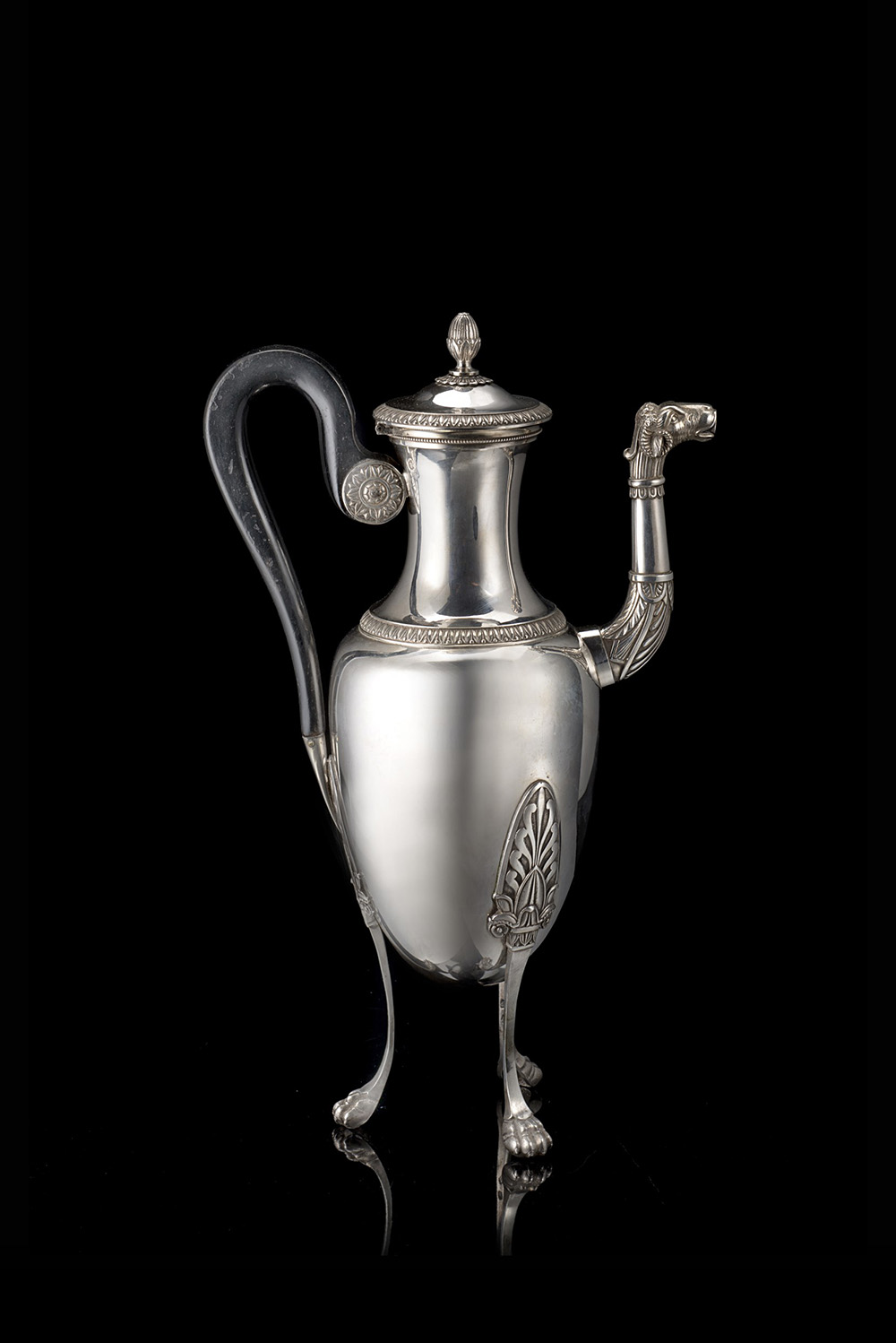 Caffettiera tripode in argento con corpo ovoidale decorata da cinture godronate e stemma inciso e versatoio con terminale zoomorfo; piedi ferini con attacchi ad anthemion; pomolo a bocciolo e manico ad ansa in legno ebanizzato. Francia, 1819-38. Argentiere JWM (h. cm 33) (g 990 ca.) (lievi difetti)
