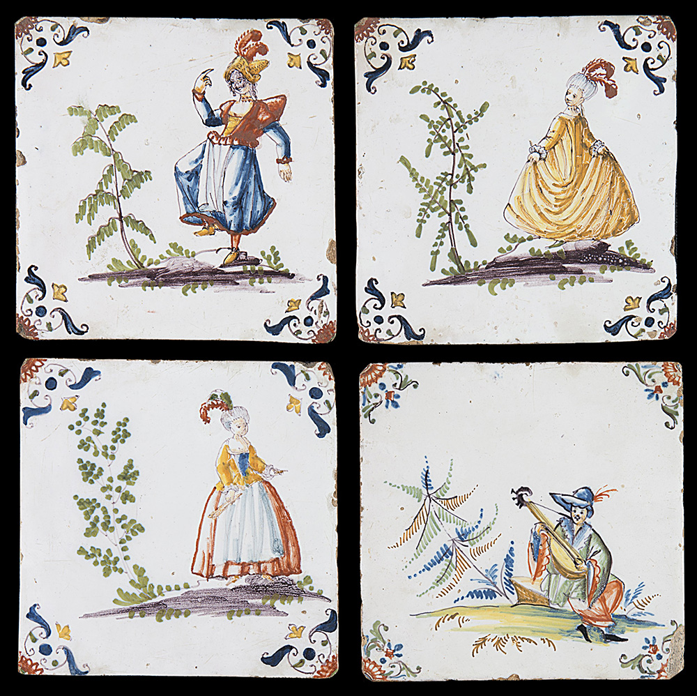 Manifattura di Felice Clerici, Milano 1756/1789.Gruppo di diciotto piastrelle quadrate in maiolica decorate in policromia a gran fuoco con personaggi e a paesini con figure di Chinesi, personaggi della Commedia dell'Arte. Sugli angoli sono dipinti riccioli di foglie e fiori. Questo tipo di piastrelle era sovente utilizzato come rivestimento da camino (cm 13,5x13,5) (difetti, mancanze e restauri) En suite con il lotto 915Esemplari simili sono conservati alle Civiche Raccolte d'Arte del Castello Sforzesco di Milano ed ancora in opera in Palazzo Morando, ora sede del Museo di Milano. Per confronti si vedano le schede a cura di R. Ausenda in 'Musei e Gallerie di Milano,Museo d'Arti Applicate Ceramiche, Tomo II', Electa 2001.