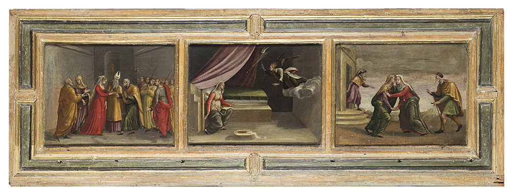 Lot 864 | Scuola toscana del secolo XVITre scene di vita della Verginetempera su tavola...