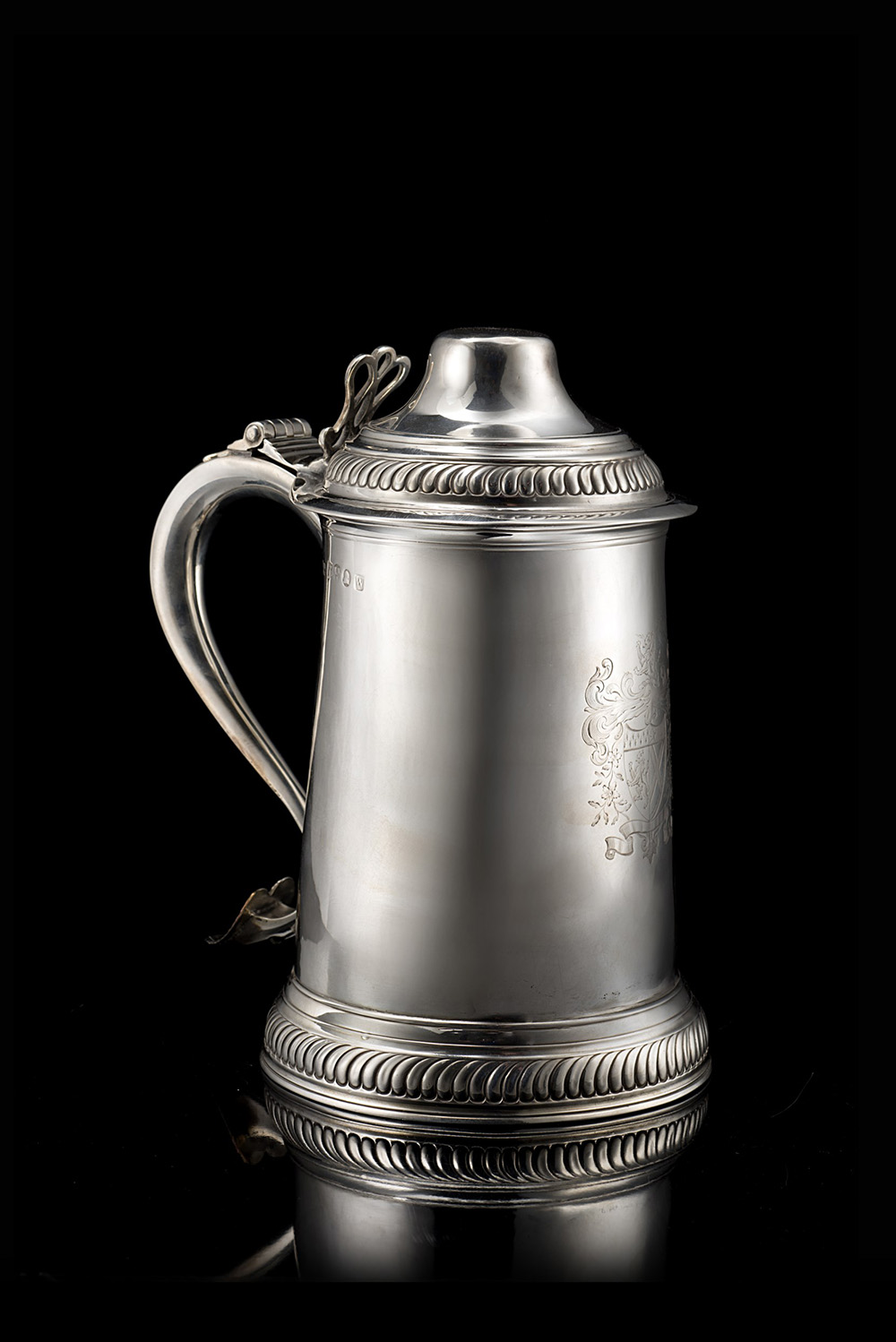 Tankard in argento con corpo cilindrico, liscio, con piede e coperchio bombato, modanati e godronati; manico a voluta con terminale a cuore. Stemma inciso. Newcastle, 1787, argentiere John Mitchison (h. cm 21) (g 990 ca.) (difetti)