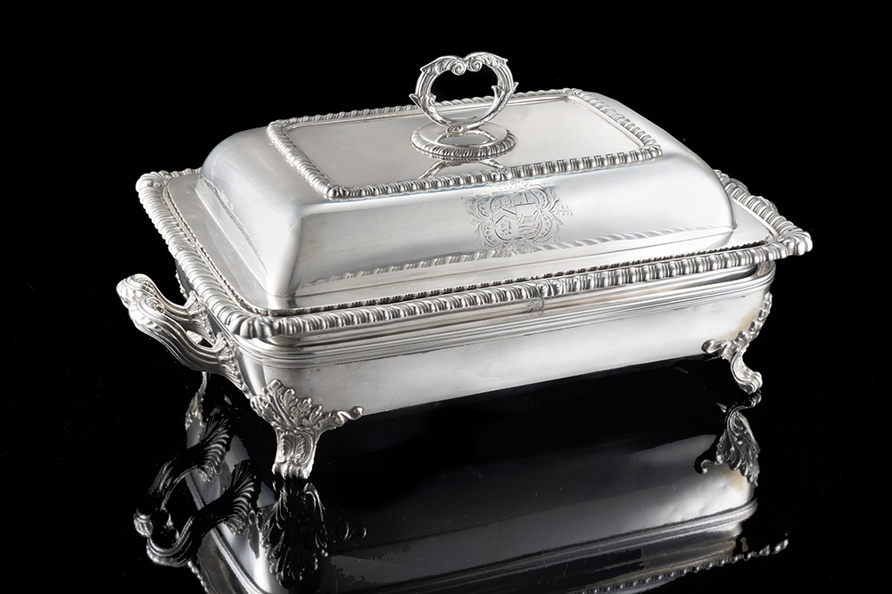 Legumiera con coperchio, in argento: corpo di forma rettangolare, con superficie liscia decorata da bordure godronate e conchiglie, e da armi nobiliari incise. Londra, 1809, Paul Storr (attr.) unito a scaldino in Old Sheffield Plate (cm 31x22,5) (g 2087 ca.) (lievi difetti)