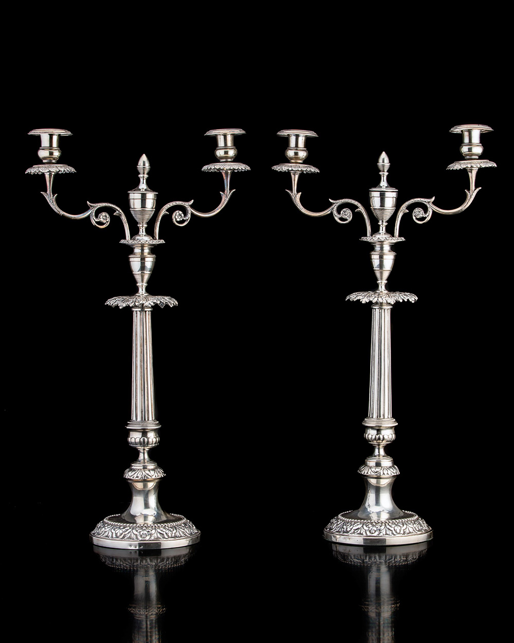 Coppia di candelabri in argento a due fiamme con piede circolare gradinato e nodo decorati con fasce fitomorfe e cintura perlinata; fusto scanalato, rastremato e godronato, ed ampio ombrello sbalzato a foglie d'acanto; bracci a volute fogliate con urna centrale.