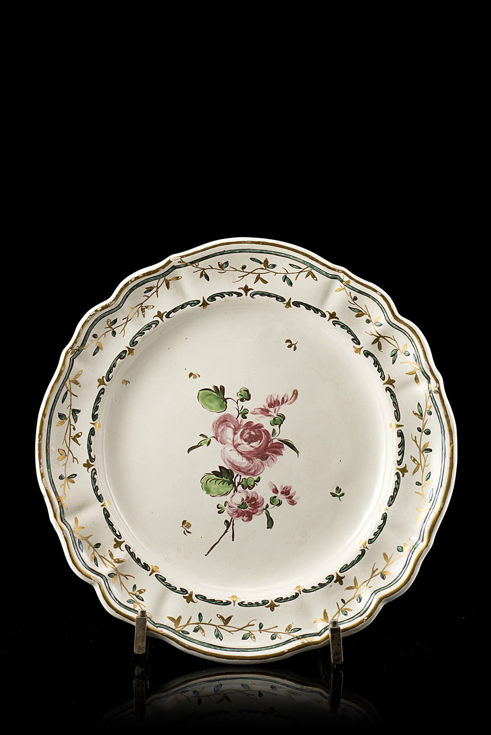 Manifattura di Pasquale Rubati, Milano 1780/90. Piatto polilobato in maiolica di forma mistilinea con tesa leggermente inclinata e costolata. Decoro centrale con mazzo di rose con colori a smalto e bordo con ghirlande vegetali in oro intrecciate a nastri in verde (d. cm 23,5) (leggere usure all'oro, puntinature allo smalto)