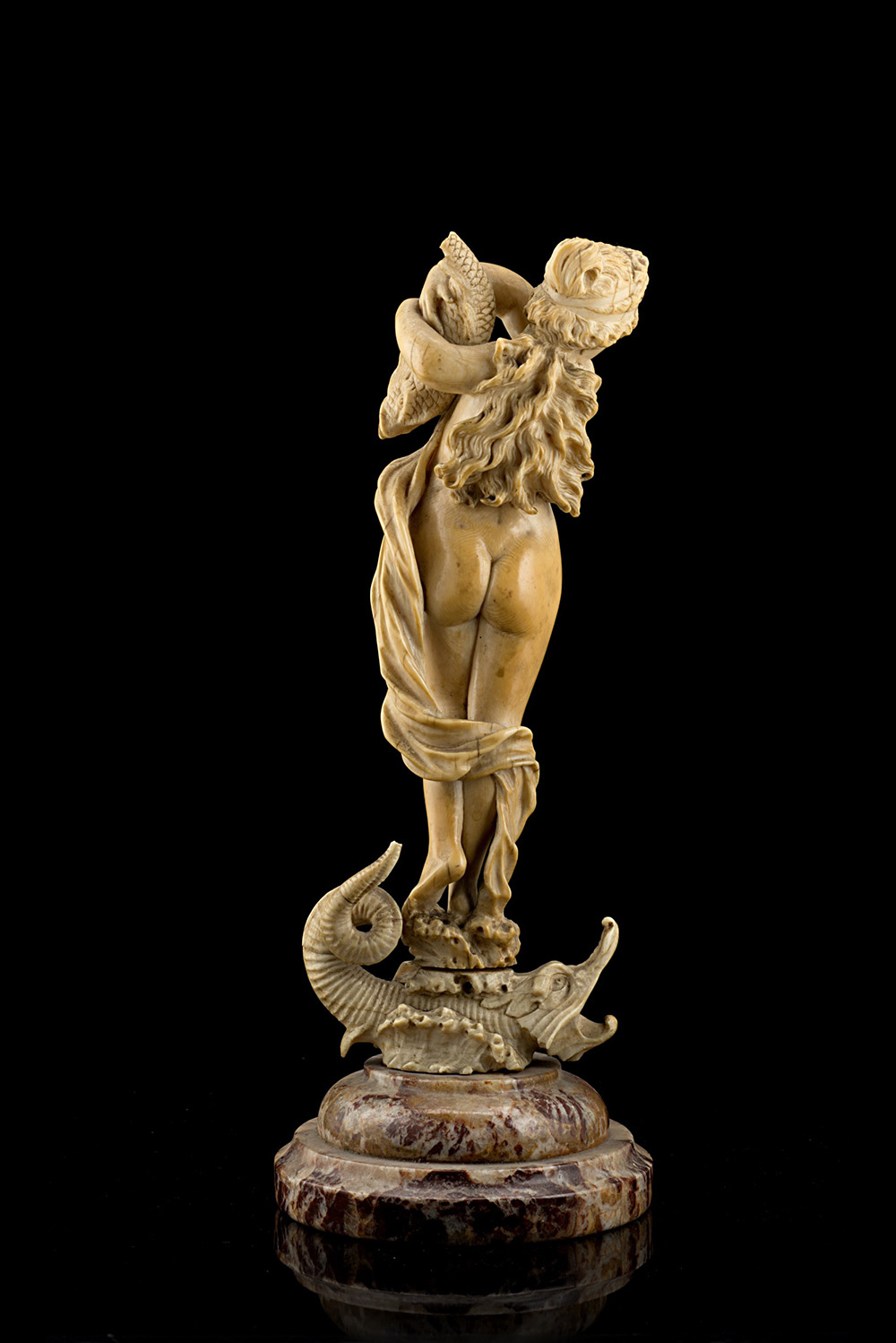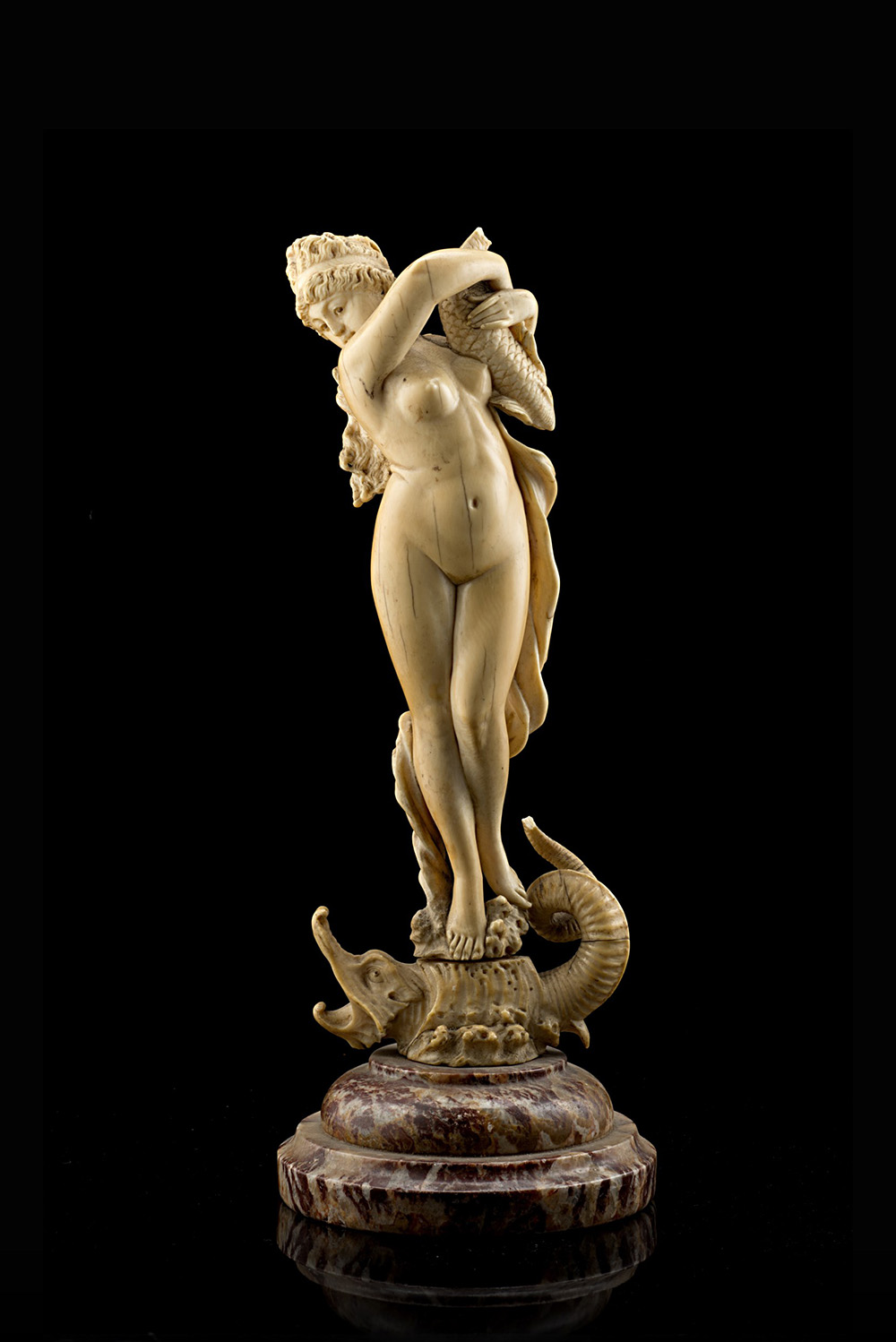 Arte europea, secolo XIX "Allegoria del mare" statuetta in avorio e figura femminile e delfino stilizzato, poggiante su base in marmo (h. cm 25) (mancanze)
