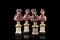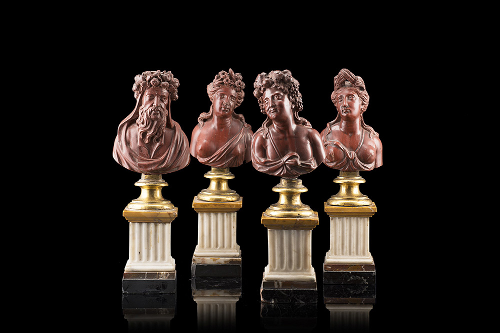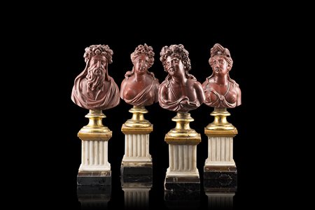 Gruppo di quattro mezzi busti in scagliola scolpiti a figure allegoriche, poggianti su basi in bronzo tornito e supporti a plinto in marmi diversi, secolo XIX (h. cm 23)