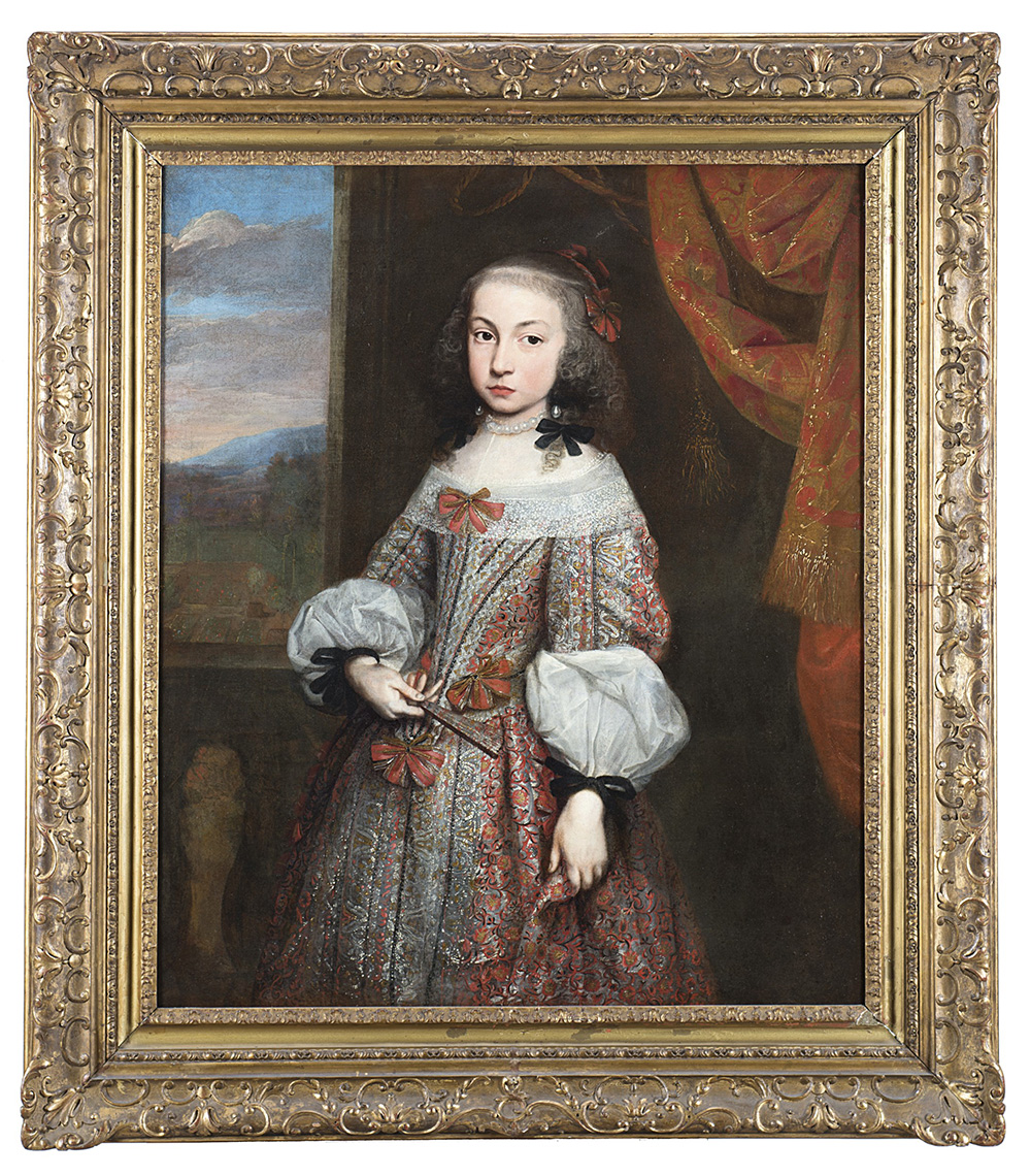 Portrait of young lady with pearl necklace, bows in her hair and fan