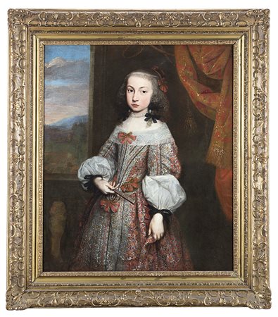 Scuola fiamminga del secolo XVII Ritratto di damigella con collana di perle,...