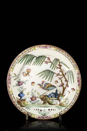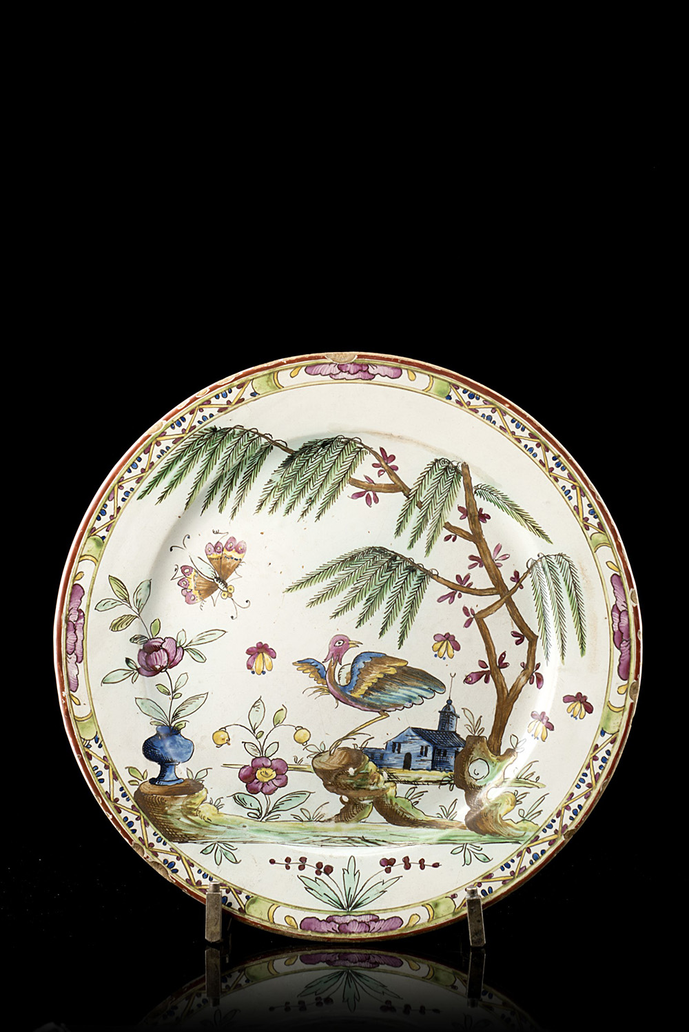 Manifattura di Pasquale Rubati, Milano 1770 Piatto in maiolica con decorazione policroma di derivazione orientale nota come 'allo struzzo' con un trampoliere sotto un salice, casa con torre, vaso con fiore di loto e farfalla (d. cm 24,5) (difetti allo smalto e sbeccature)Sul retro è presente l'etichetta cartacea dell'esposizione 'Museo Poldi Pezzoli. Mostra di Maioliche di Lodi, Milano e Pavia. N. 7 Coll. E. Zeri'. Il piatto è pubblicato al n. 232 di 'Maioliche di Lodi, Milano e Pavia', catalogo della mostra, a cura di G. Gregorietti, Museo Poldi Pezzoli, Milano 1964