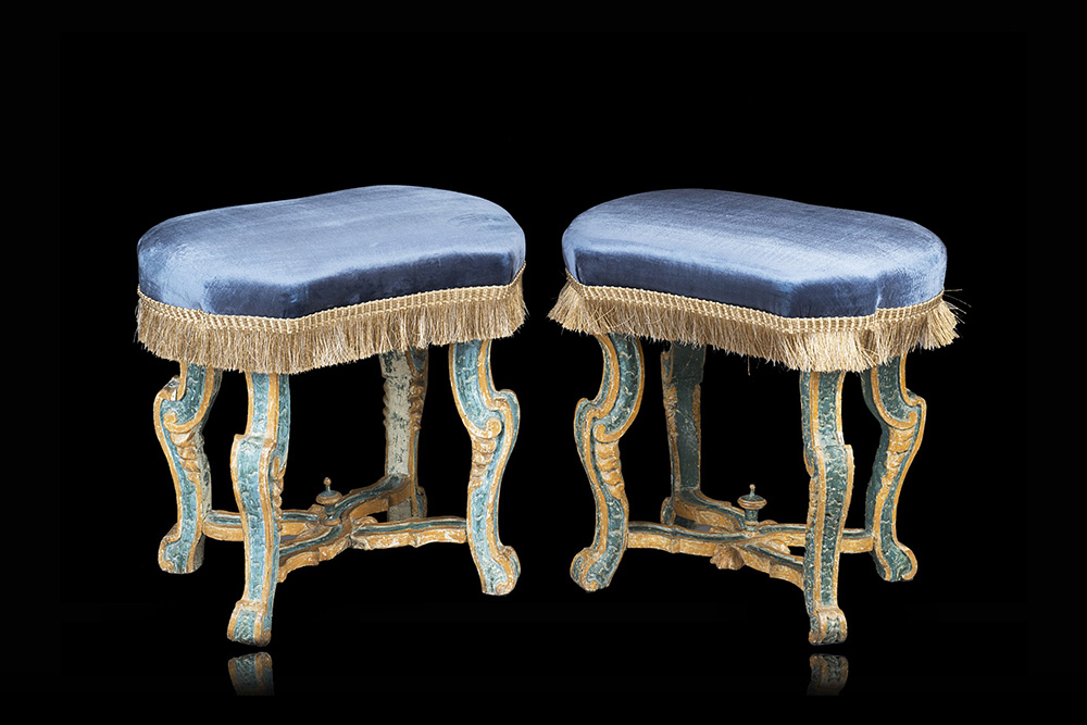 Coppia di panchetti in legno laccato gambe e traverse sagomate scolpite a motivi vegetali e conchiglia stilizzate. Traverse sormontate da pinnacolo tornito. Secolo XVIII (difetti e restauri)