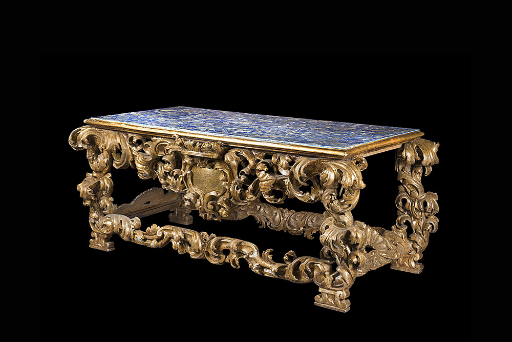Antico tavolo da parete in legno scolpito e dorato a foglie, volute e stemma araldico al centro della fascia. Gambe riunite da traverse intagliate. Piano lastronato in pietra dura (cm 240x95x102) (difetti)