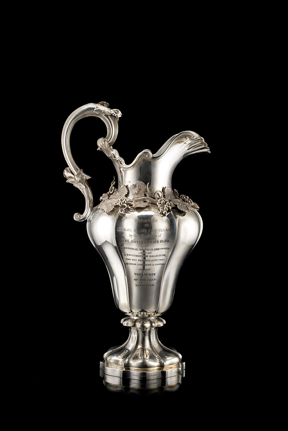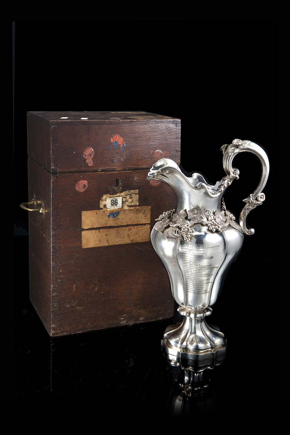 Caraffa per vino, in argento, con corpo ad alta spalla sagomato a baccellature e nervature radiali, con fascia di tralci d'uva applicata; dedica incisa. Londra 1832, argentiere J.C. Edington. (h. cm 39,5) (g 1860 ca.) (difetti) completa di custodia in legno