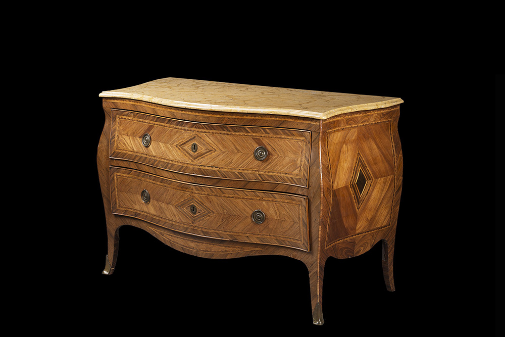 Comò di forma mossa a due cassetti interamente lastronato e filettato in legni vari a motivi geometrici e concatenati. Gambe mosse. Piano in marmo. Napoli, secolo XVIII (cm 140x93x70) (lievi difetti)