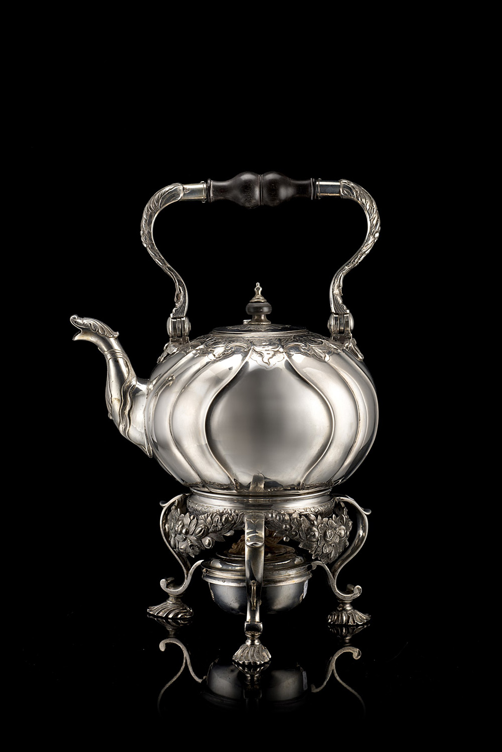 Teiera con supporto in argento, con corpo di forma globulare, decorato con nervature mosse, fascia di volute e frange zigrinate, e festoni di frutta. Mosca, 1761 (h. cm senza manico 23) (g 1500 ca.) (difetti)