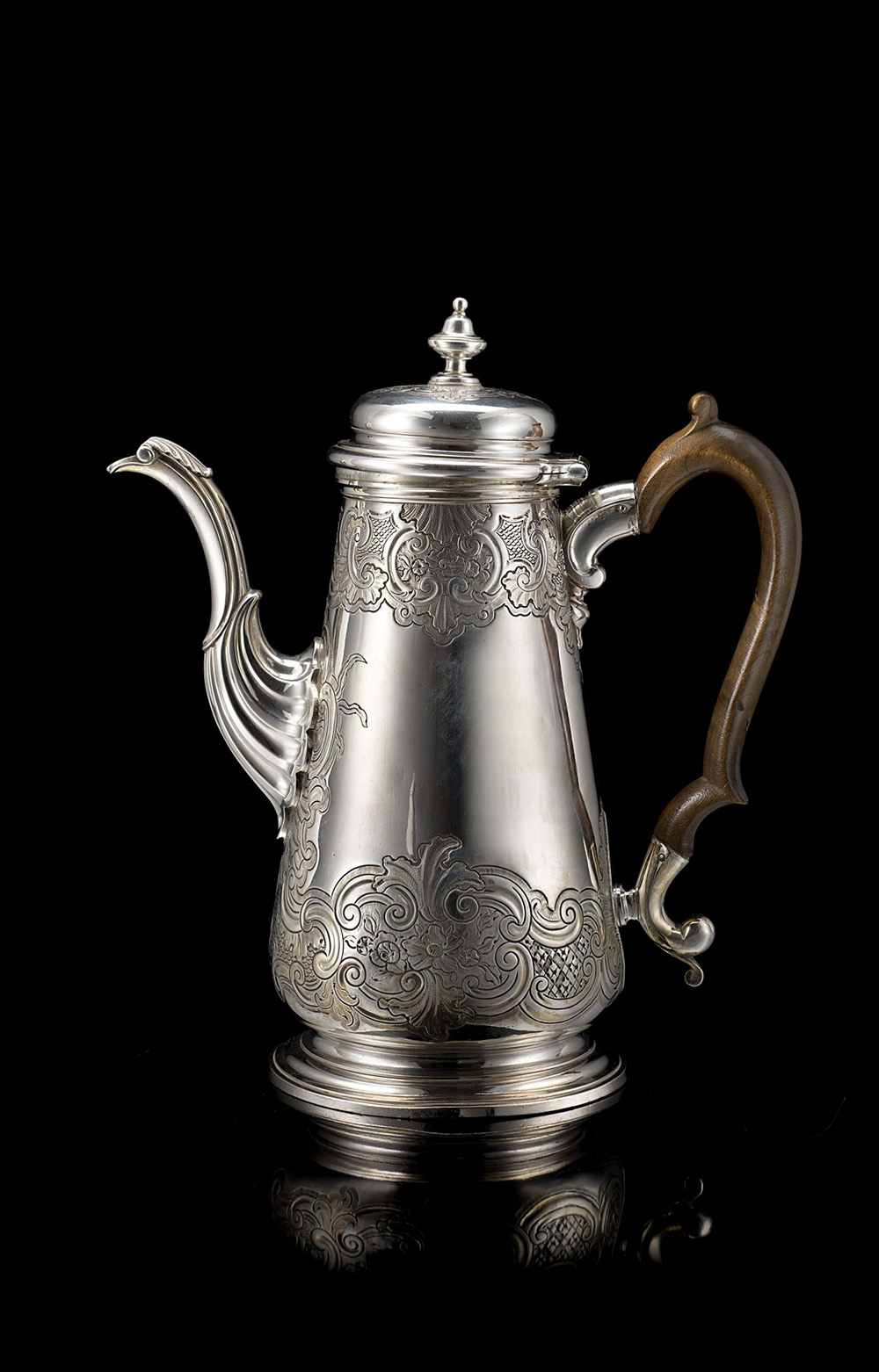 Caffettiera in argento con corpo piriforme, decorato da fasce cesellate a volute e motivi floreali su fondo zigrinato; versatoio a collo di cigno, coperchio bombato e pomolo a trottola, manico a voluta in legno. Londra, 1740, argentiere John Pero (h. cm 25) (g 1080 ca.)