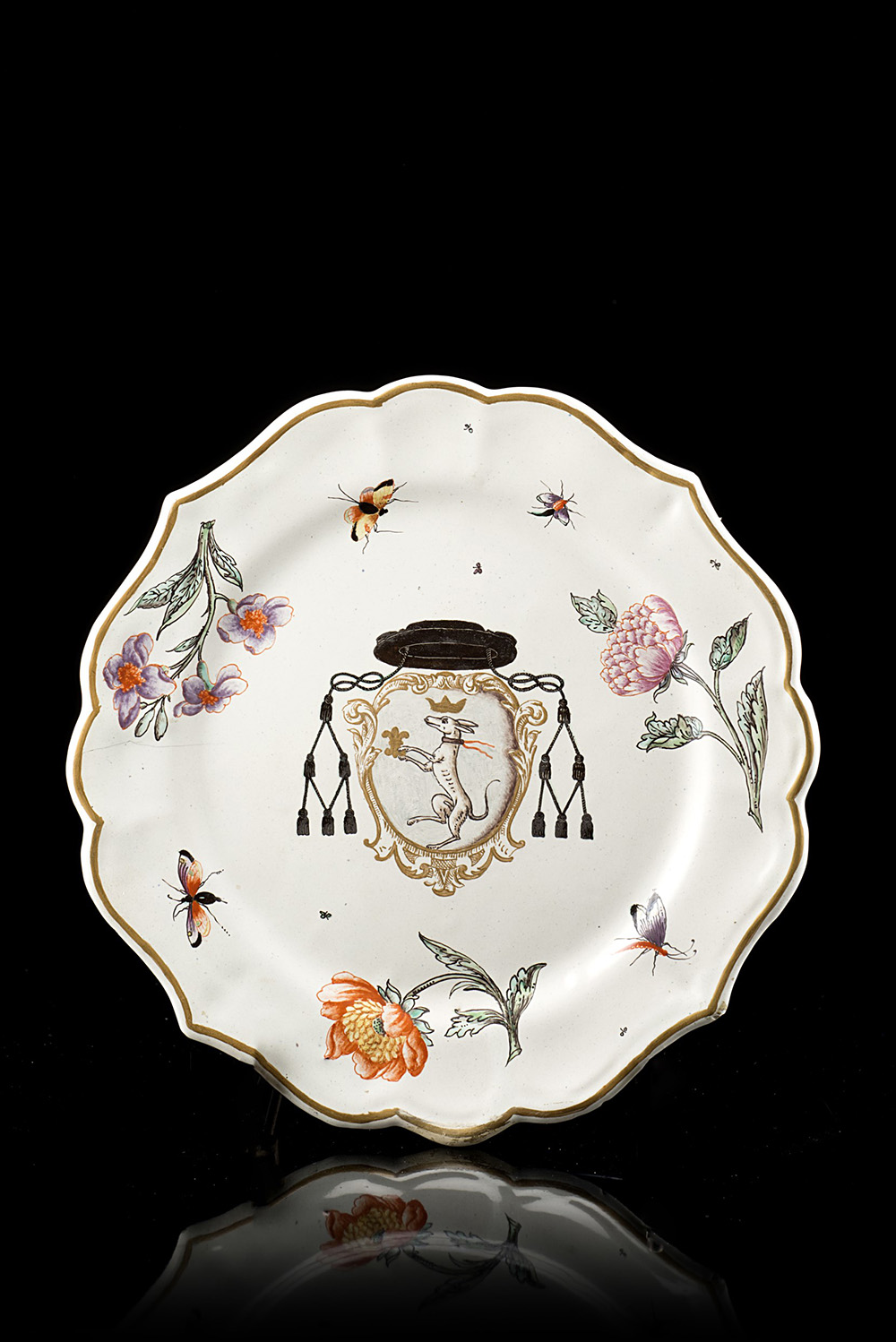 Manifattura di Felice Clerici, Milano, 1770/80. Piatto in maiolica a bordo mistilineo decorato a stemma con cappello cardinalizio, fiori recisi e farfalle ai lati. Bordo profilato in oro (d. cm 20) (felatura e restauro al bordo)