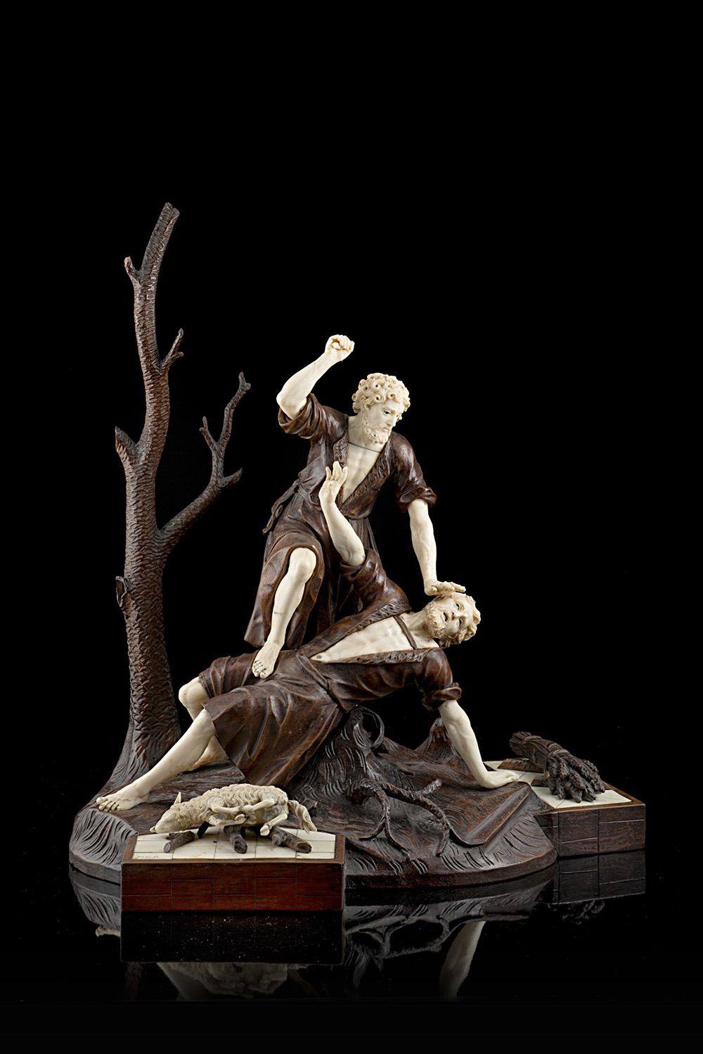 Workshop of Simon Troger (1683 - 1768) "Cain and Abel" wooden and ivory sculpture with glass eyes (h. cm 35,5) initialled "M.K.B." on the base (losses)