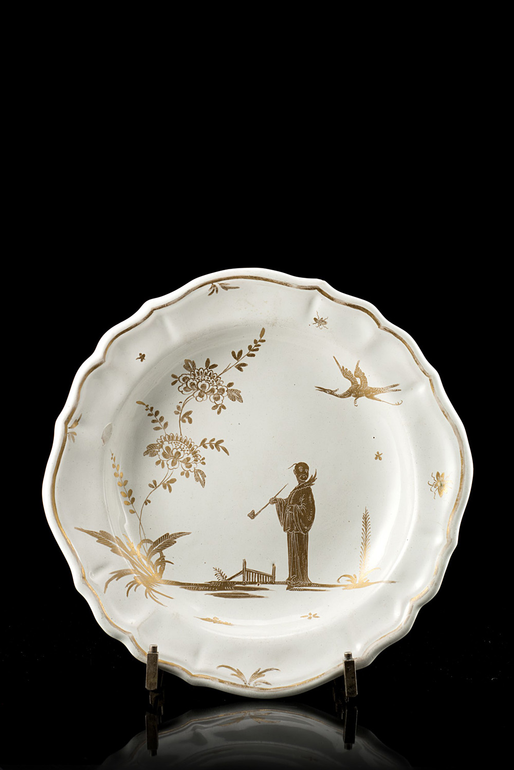Manifattura di Felice Clerici o Pasquale Rubati, Milano 1760-1780. Piatto fondo mistilineo in maiolica con decorazione 'alla chinese' con orientale in un paesaggio che fuma la pipa. Decorazione in oro lavorato con una punta sottile per graffiare i particolari disegnativi (d. cm 23,5) (usure, puntinatura e lacuna allo smalto)