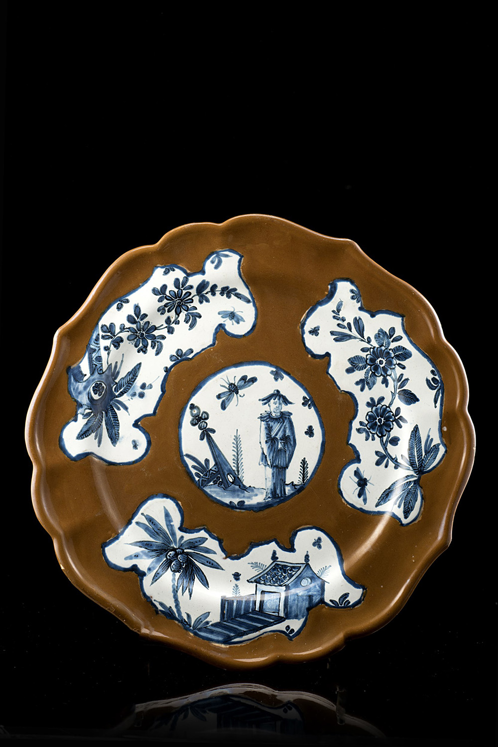 Manifattura di Felice Clerici, Milano 1745/80. Piatto polilobato in maiolica a smalto marrone con decorazione nota come 'a comparto caffè dipinto alla chinese in blu' con, riserve polilobate e medaglione centrale con scene monocrome blu di fiori, pagoda e figura (d. cm 24,2) (lievi restauri)Pubblicato da Caviglia alla scheda n. 14 del catalogo dell'esposizione 'Figure e Chinesi - Maioliche milanesi di Felice Clerici', Milano, maggio 1995. Per confronto si veda 'Maioliche di Lodi, Milano e Pavia', catalogo della mostra, a cura di G. Gregorietti, Museo Poldi Pezzoli, Milano 1964