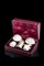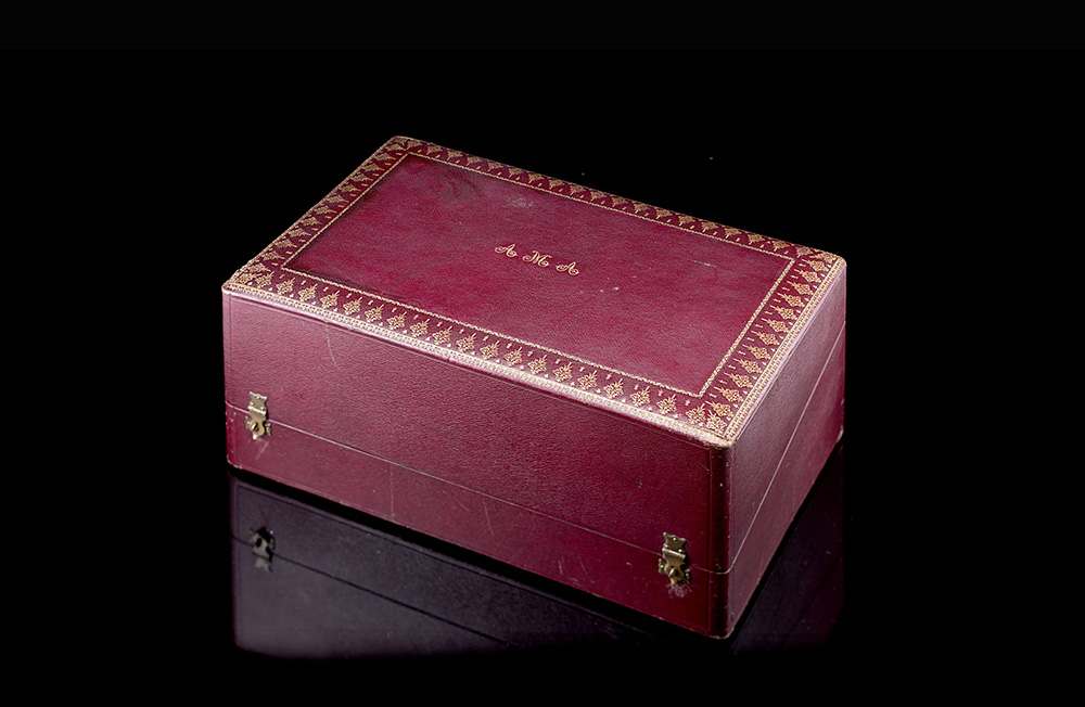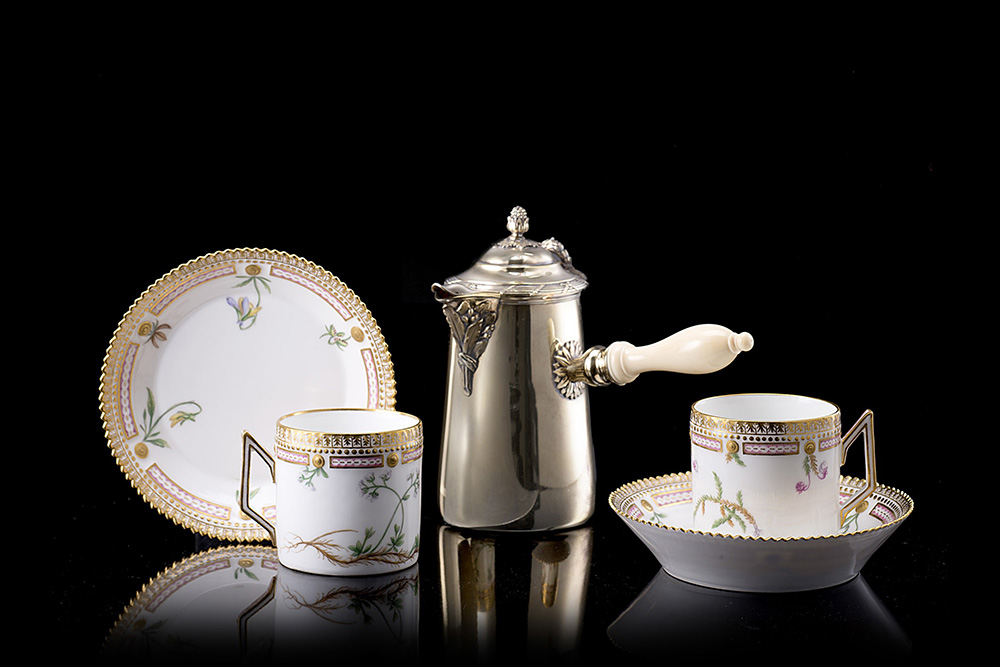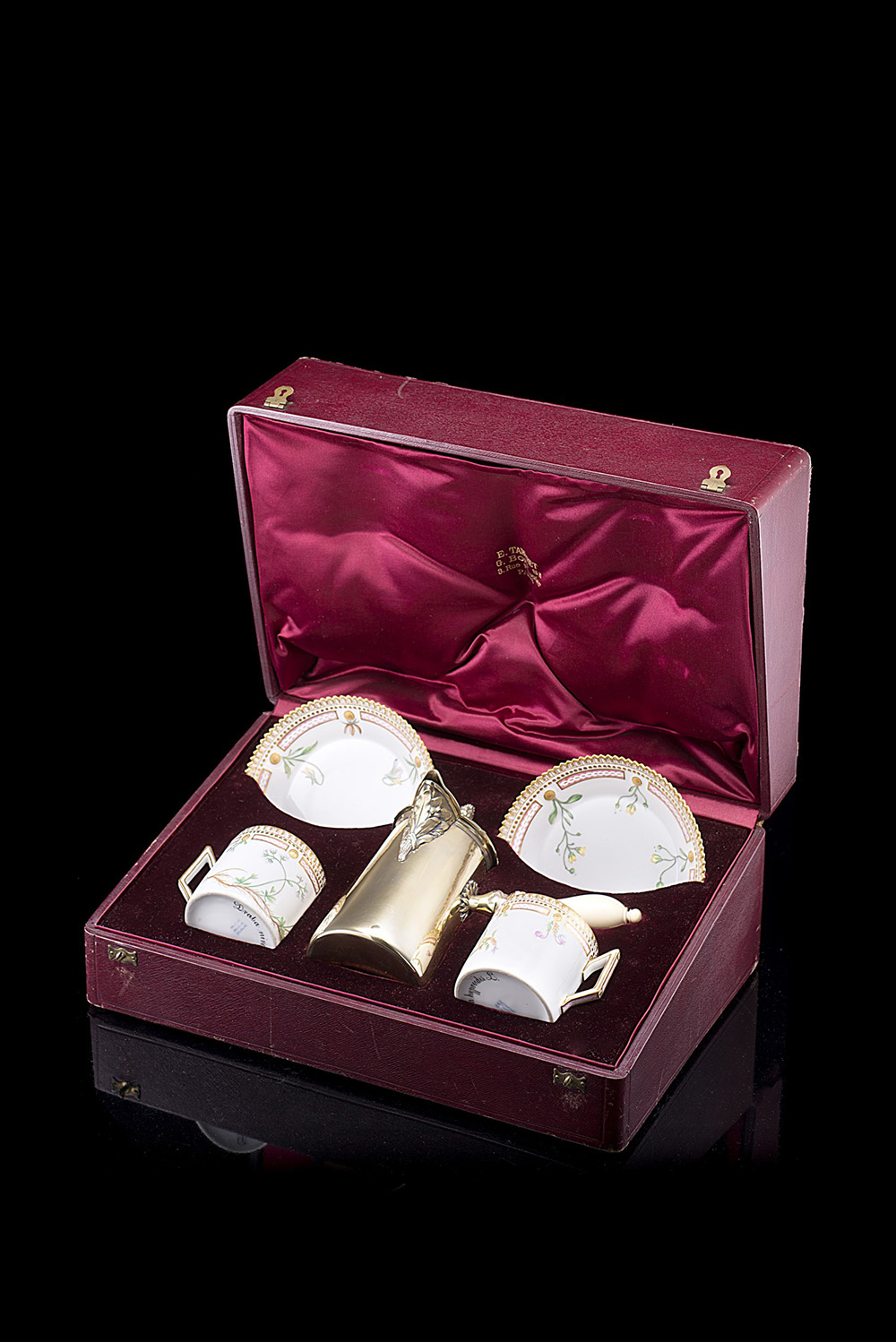 Servizio in custodia composto da una cioccolatiera in argento dorato a corpo liscio, argentiere Boin Taburet a Paris (h. cm 15,5) (g 390 ca.) e una coppia di tazzine da caffè con piattini in porcellana con decoro 'Flora Danica'. Marca di fabbrica in blu sotto vernice. Copenhagen, Regia Fabbrica di Porcellane, secolo XIX. Custodia in pelle impressa in oro cifrato 'A.M.A' sul coperchio.Provenienza: Antichità Marco Brunelli, Milano Nel 1790, la manifattura danese (fondata nel 1775) iniziò la realizzazione del monumentale servizio 'Flora Danica' in smalti policromi ed oro, commissionato dalla famiglia reale danese come dono per l'imperatrice di Russia Caterina II, collezionista di porcellane. Il servizio ritrae con precisione i fiori botanici catalogati da Linneo nella sua opera Flora Danica che riproduce realisticamente la flora danese. La precisione nella resa dei dipinti su porcellana, uno diverso dall'altro, e la monumentalità del servizio (circa 2500 pezzi) richiese anni di lavorazione e non venne mai consegnato a Caterina II (morta nel 1796). Nel 1803 il re ordinò di interrompere l'opera di cui erano stati già realizzati 1600 esemplari. Nel 1890 la Royal Copenhagen aprì un primo negozio a Parigi. 'Flora Danica', ancora oggi prodotto, resta il più numeroso servizio realizzato da una manifattura di porcellane. Le due tazzine sono contenute in un cofanetto rivestito in pelle bordeaux con profili impressi in oro e le iniziali dorate di appartenenza A.M.A al centro del coperchio. Sulla fodera del coperchio all'interno del cofanetto stampato 'E. Taburet e G. Boin - 3 Rue Pasquier - Paris'. Nel 1860, a Parigi, George Boin, orfevre et marchand d'objets anciens, si associa con il Bijoutier Emile Taburet