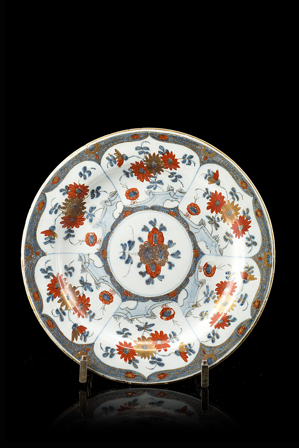 Manifattura di Pasquale Rubati, Milano 1770/80. Piatto tondo in maiolica con bordo profilato in oro con riserve radiali Imari in blu, rosso e oro con rocce in azzurro, fiori e spirali. Sul retro la marca in bruno F.P.R (d. cm 23,2)