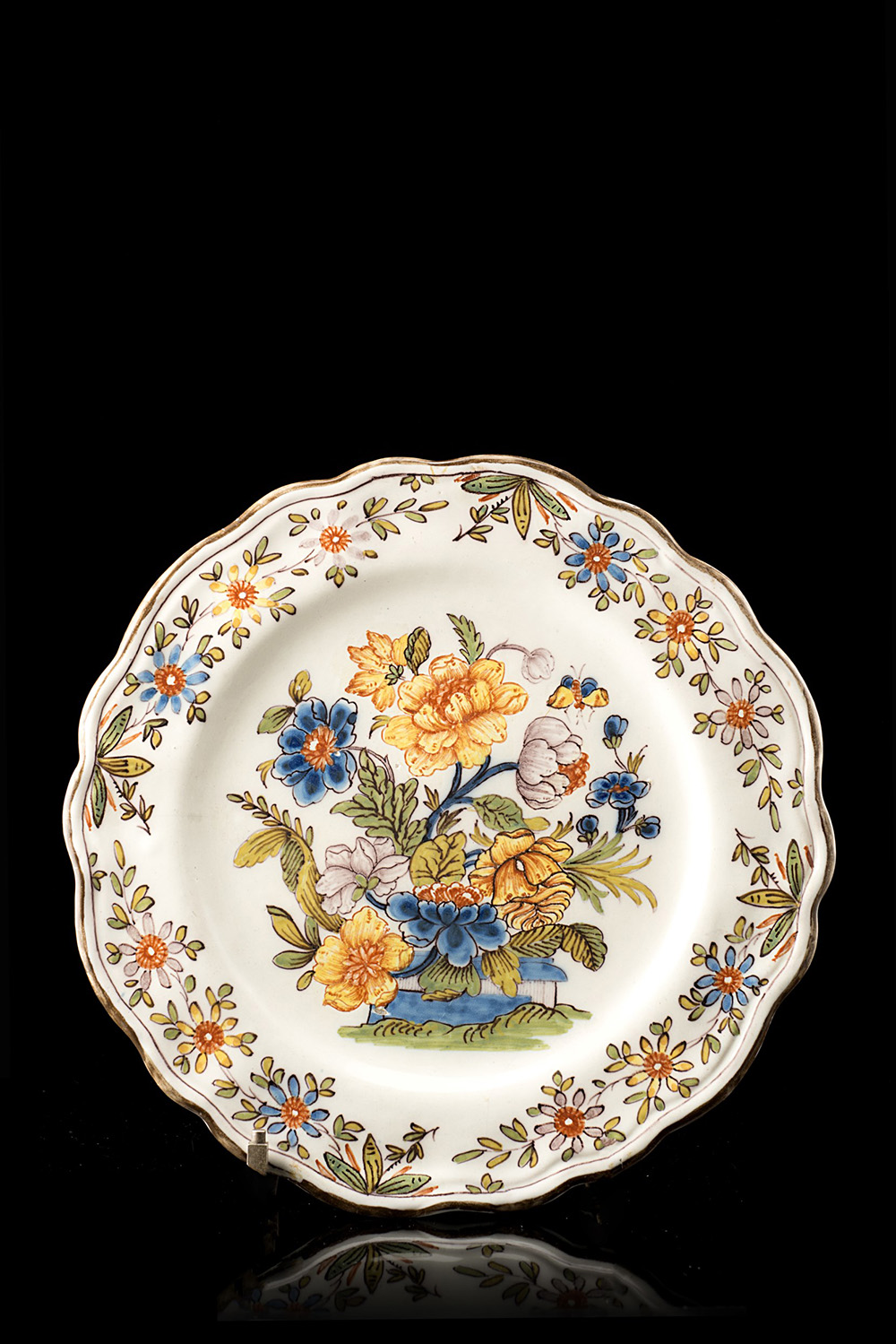 Manifattura di Felice Clerici, Milano 1745/80. Piatto ad orlo mistilineo in maiolica con decorazione a gran fuoco con bordura a corolle di fiori ed al centro grande mazzo di fiori policromi (d. cm 24)Per confronti si veda veda Saul Levy, 'Maioliche Settecentesche Lombarde e Venete', Tav. 68A, Gorlich, 1964