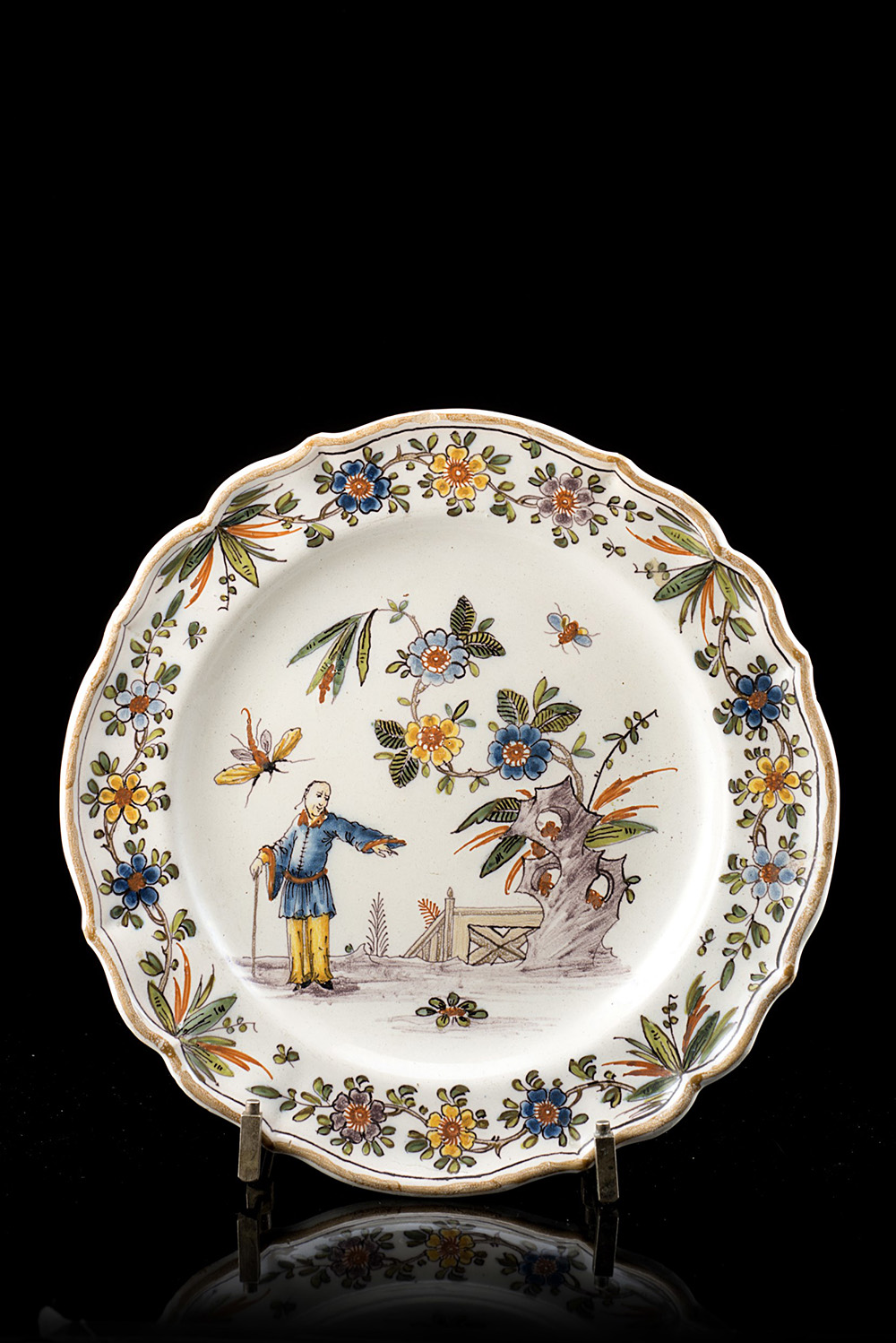 Manifattura di Felice Clerici, Milano 1745/80. Piatto tondo in maiolica con bordo profilato in bruno e decoro 'a chinesi coloretti' con rami e fiori di pesco, pagoda e figura orientale (d. cm 24) (lieve sbeccatura)Sul retro è presente etichetta ' Antonia Gianetti Antichità - via Gesù 7 - Milano'