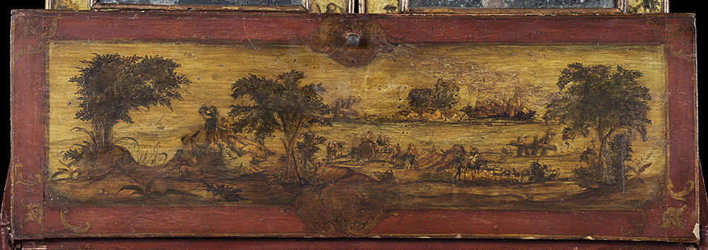 Trumeau "ad arte povera" con parte superiore a due ante a specchi con cimasa decorata e intagliata a fiori e mascheroni. Parte inferiore di forma mossa a tre cassetti con anta ribaltabile celante vani, cassettini e segreto. Veneto, secolo XVIII (cm 110x236x54) (difetti)