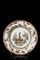 Manifattura di Pasquale Rubati, Milano 1770. Piatto tondo in maiolica con bordo liscio, tesa leggermente inclinata e fondo ribassato. Bordo con motivo a graticcio su fondo rosa e onda che inquadra il medaglione centrale con scena orientale con due volatili accostati tra foglie e peonie in oro (d. cm 23) Sul retro compare il cerchio in bruno