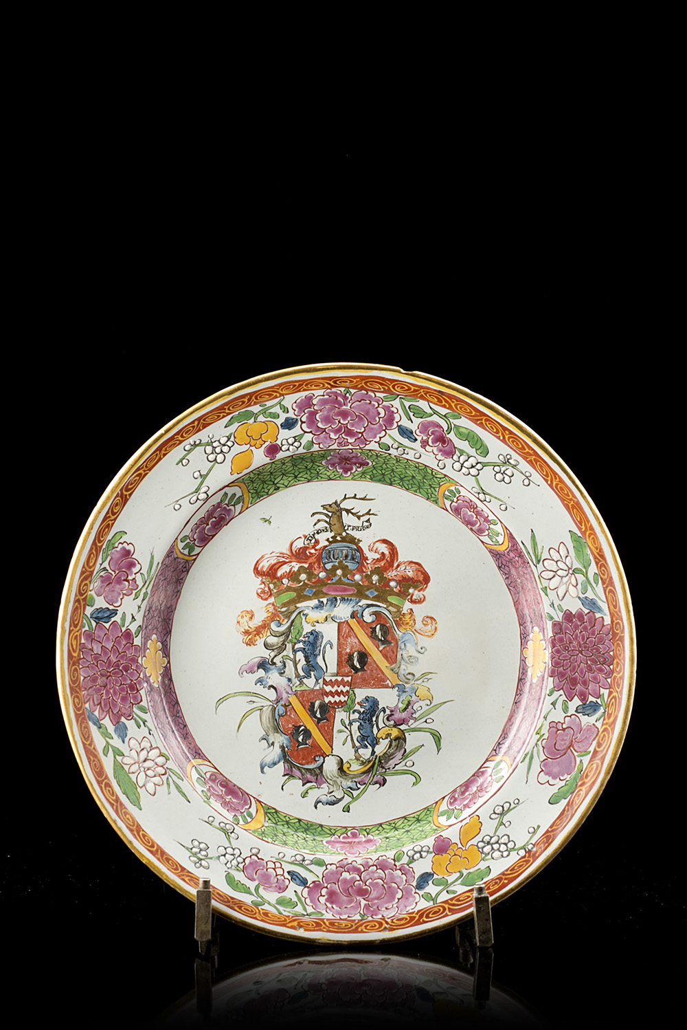Felice Clerici manufacture, Milan 1760/80. A majolica dish (d. cm 23,5) Coat of arms of the Marquess Don Giovanni Corrado de Olivera, president of the Senate and State Councilor of Milan in 1771.