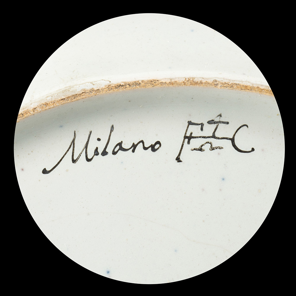 For comparison see: plate n. 296, R. Ausenda in 'Musei e Gallerie di Milano - Museo d'Arti Applicate Ceramiche', Tomo II, Electa 2001; 'Maioliche Settecentesche. Milano e altre fabbriche. Ceramiche della collezione Gianetti', R. Ausenda, n. 39, 1996