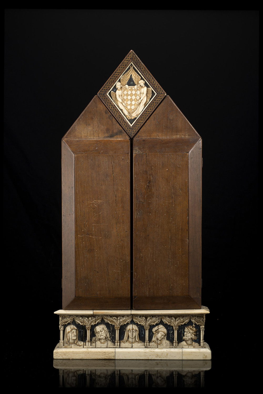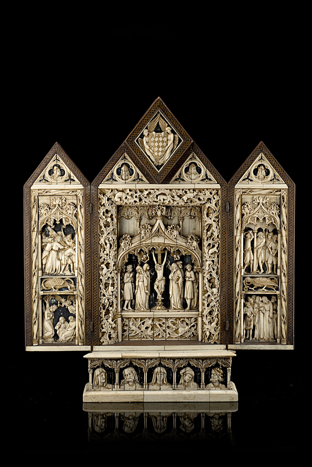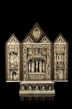 Antico trittico in avorio, osso e legno raffigurante la Crocifissione e scene della vita di Cristo con particolari parzialmente dorati e dipinti. Sezione centrale incorniciata da arco gotico, motivi fogliati e sormontata da stemma sorretto da figure alate. Pannelli laterali decorati ad architetture e simboli della Passione. Paliotto con volti di santi entro modanature nella base (h. cm 56; l. da aperto cm 51) Etichette al retro (lievi difetti e restauri)