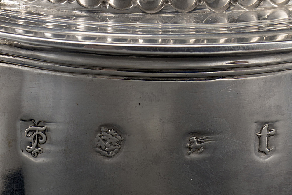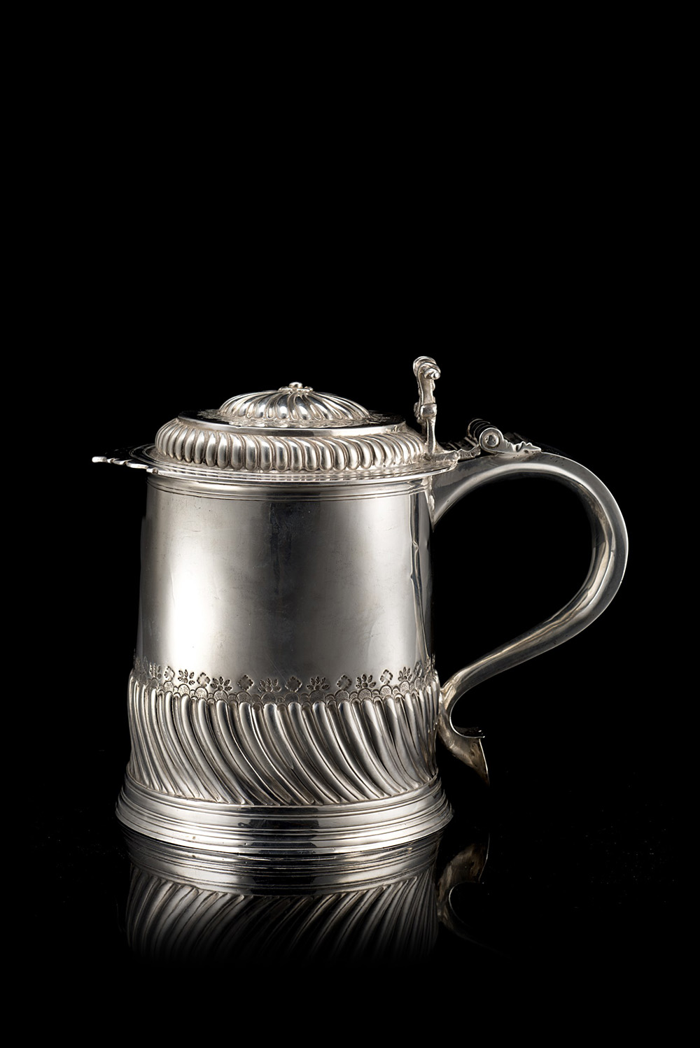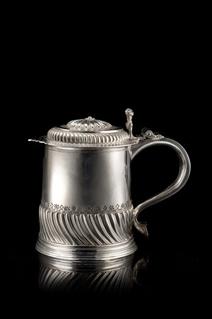 Tankard in argento di forma cilindrica, decorato con fasce di baccellature mosse e cintura di motivi floreali incisi; manico a voluta. Londra 1696 (?) possibile argentiere John Penfold (h. cm 16,5 ca.) (g 750 ca) (difetti)