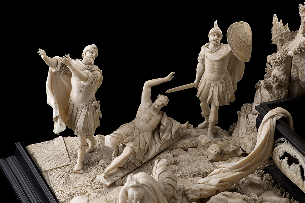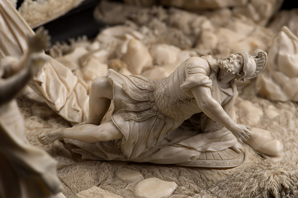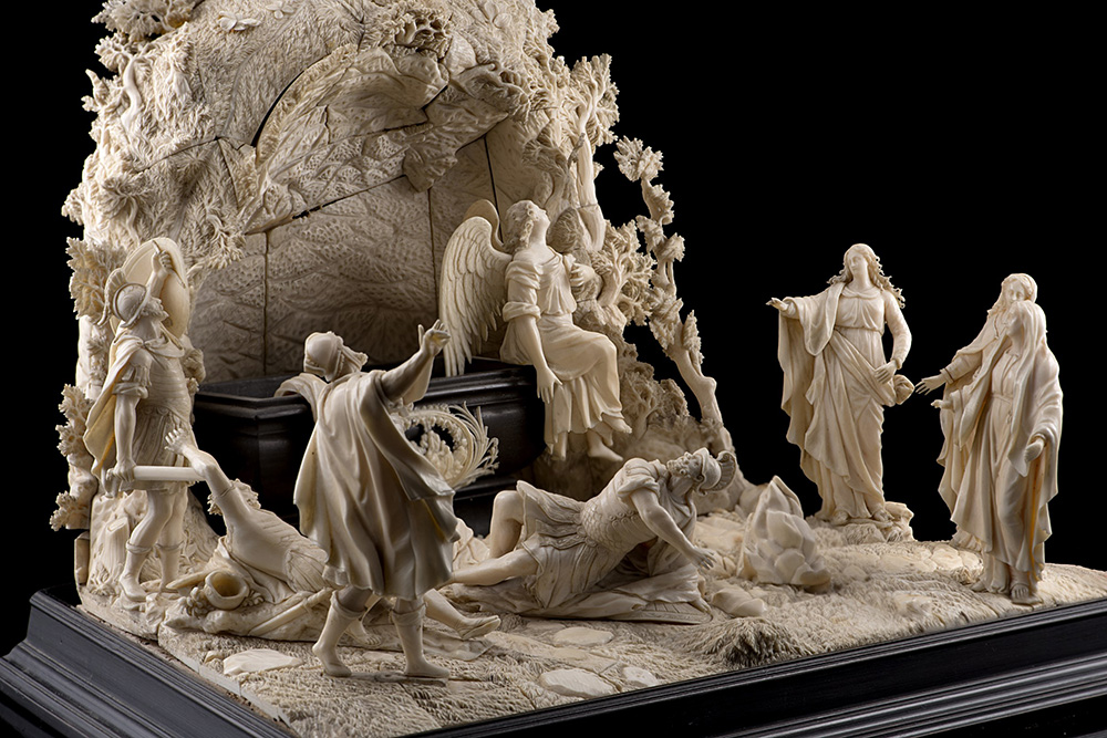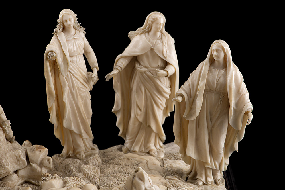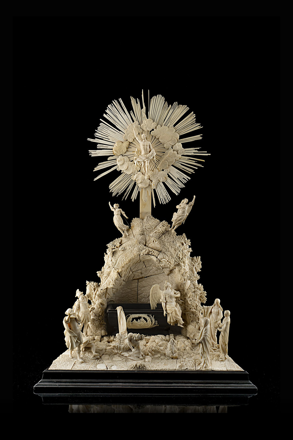 Manifattura europea, secolo XVIII. Gruppo scultoreo in avorio raffigurante l'Ascensione di Cristo con figure a tutto tondo e ambientazione in tessere incise e scolpite a foglie e rocce. Base e sarcofago in legno ebanizzato e decorato da placca con scena della vita di Cristo (cm 28x43) (mancanze e restauri, base d'epoca posteriore)