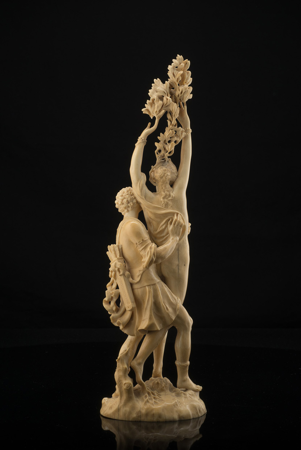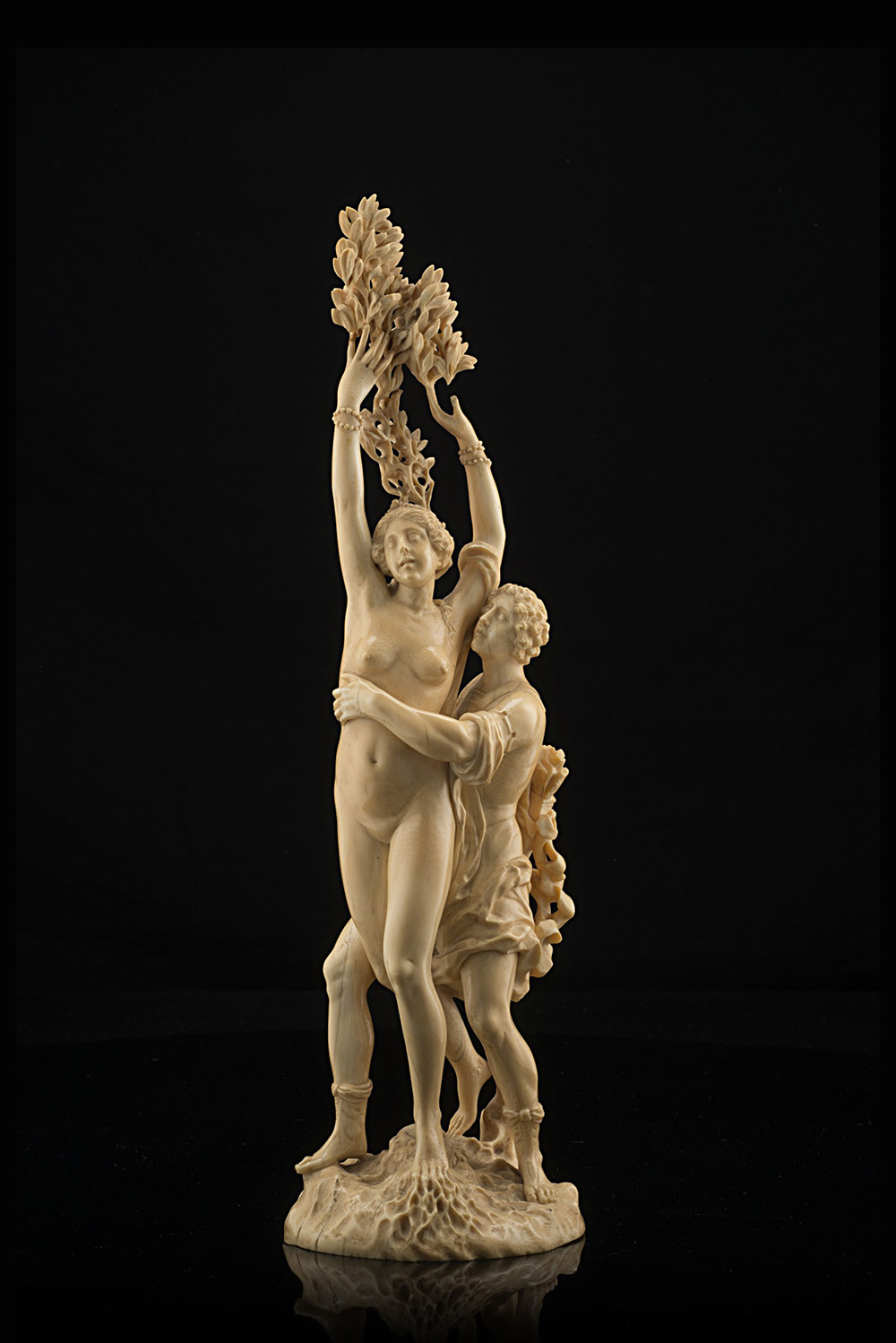18th-century Northern European artist "Apollo and Daphne" ivory sculpture (h. cm 41) attributed to Peter Hencke. Initialled P. H. and dated 1761 on the base (defects)