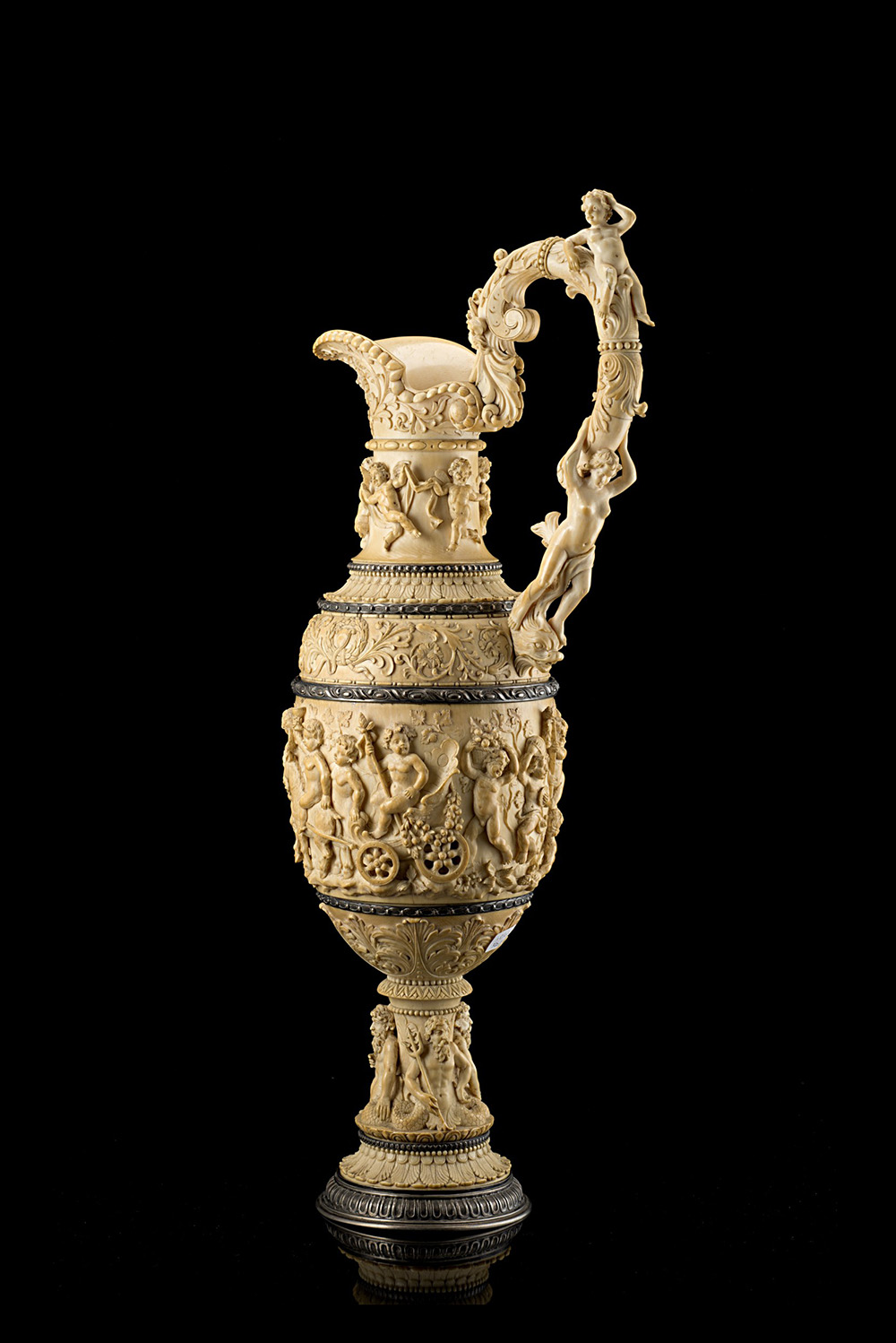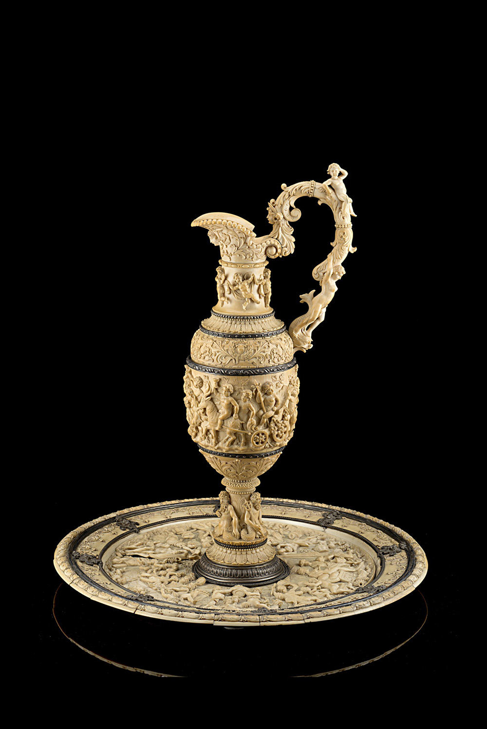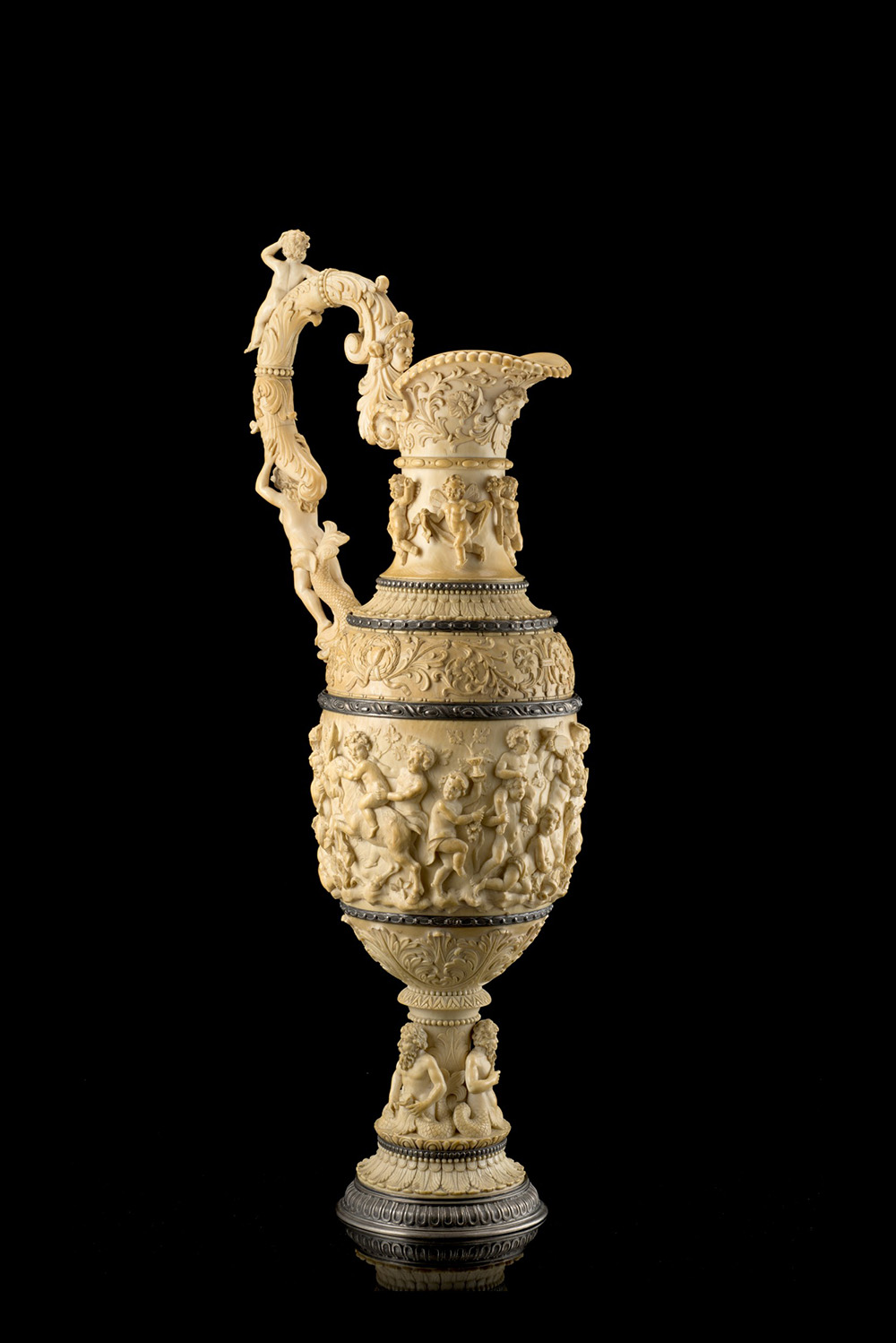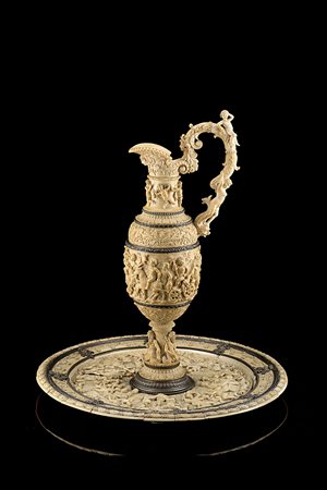 (attr.) Acquamanile con piatto in bronzo lastronato in avorio scolpito nel cavetto con scene di baccanali tra menadi e satiri, falda decorata a motivi concatenati e ghiere in argento con mascheroni che sorreggono vasi con frutti e fiori. Versatoio in avorio scolpito con putti nella fascia centrale; ansa intagliata a tutto tondo a putto e figura femminile su delfino; base con tritoni e motivi fogliati. Ghiere in argento a perlinature e motivi concatenati (d. piatto cm 50 x h. tot. cm 62) (lievi difetti)