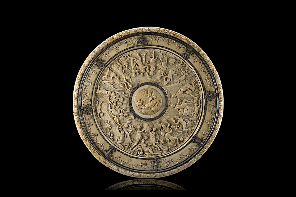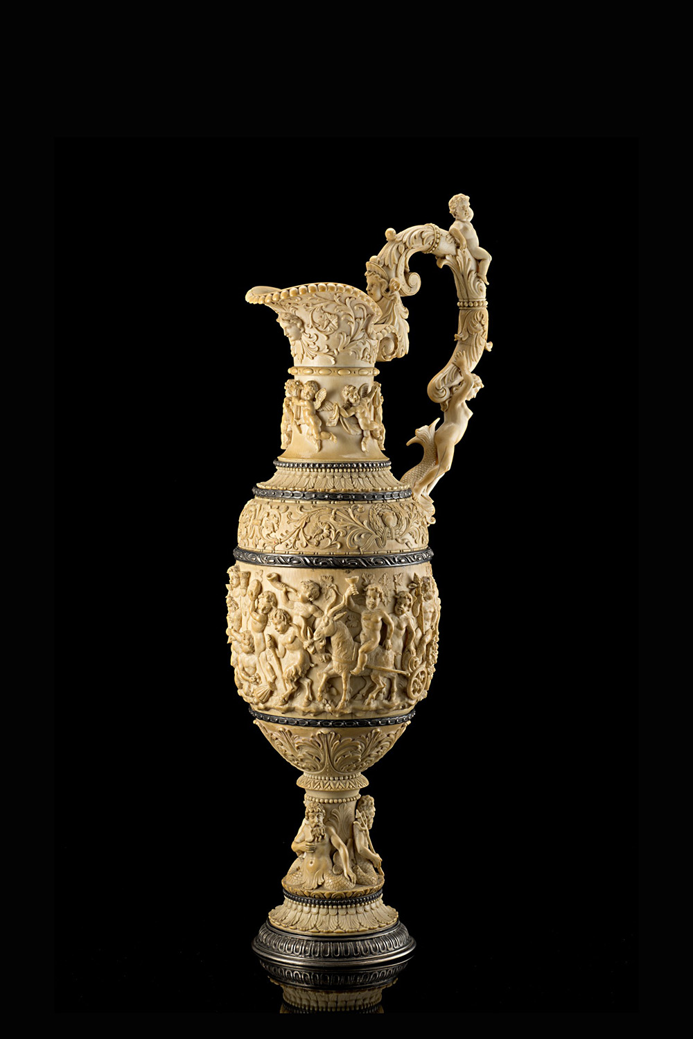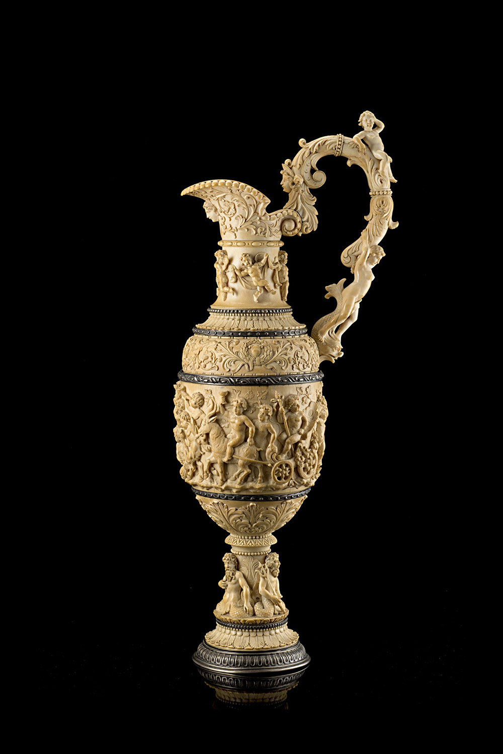 (attr.) Acquamanile con piatto in bronzo lastronato in avorio scolpito nel cavetto con scene di baccanali tra menadi e satiri, falda decorata a motivi concatenati e ghiere in argento con mascheroni che sorreggono vasi con frutti e fiori. Versatoio in avorio scolpito con putti nella fascia centrale; ansa intagliata a tutto tondo a putto e figura femminile su delfino; base con tritoni e motivi fogliati. Ghiere in argento a perlinature e motivi concatenati (d. piatto cm 50 x h. tot. cm 62) (lievi difetti)