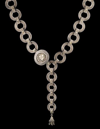 Gran collare ottomano in argento finemente cesellato, sul medaglione centrale le armi dell'impero ottomano con marchio riconducibile ad Abdel El-Hamid. Il collare è composto da cerchi immagliati tra loro con passanti riportanti la stella a cinque punte, molto probabilmente appartenuto ad un ambasciatore ottomano (440 g, mancante di tre stellette) (difetti)
