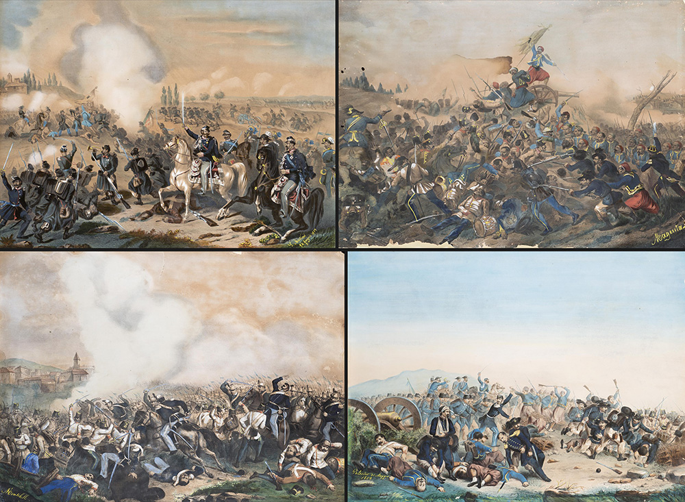 Lotto composto da quattro grandi incisioni acquarellate inerenti alla Seconda Guerra di Indipendenza, tra cui: la carica dei lancieri contro la fanteria austriaca a Montebello; episodio della battaglia di Palestro, datato 31 maggio 1859 - in cui vennero ingaggiati bersaglieri piemontesi e zuavi francesi contro la fanteria austriaca; episodio della battaglia di San Martino, datato 24 giugno 1859, in cui il Re Vittorio Emanuele e il Suo Stato Maggiore spronano i piemontesi all'assalto; Episodio della battaglia di Magenta - con la presa della bandiera di un reggimento austriaco su uno zuavo francese (cm 70x52) In cornici (difetti e mancanze)