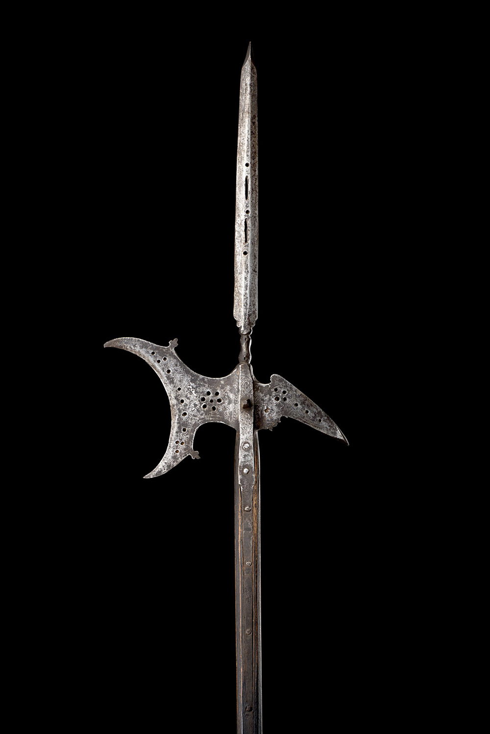 Alabarda a rostro, Veneto, fine sec. XVI - inizio sec. XVII. Lama centrale traforata e rinforzata in punta. Rostro con traforazioni ed incisioni a motivi geometrici. (lunghezza del ferro cm 57) (difetti)