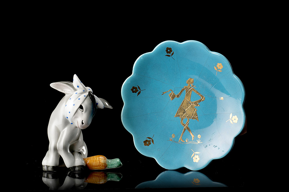 Lot of two sculptures: "Asinello malato" by Camillo Ghico and a centrepiece. Polychrome underglaze cast ceramic and a sky-blue glaze cast ceramic with gold-plating. Turin, 1930s. Signed under the base "Lenci MADE IN ITALY TORINO" and "Lenci MADE IN ITALY" and with the initials "SZ" of the decorator. The first sculpture has the paper label. (h max cm 10.5; d cm 14) (slight defects)