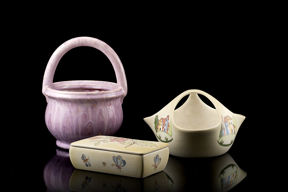 Lot of a cake box, a flower basket and a box with cover. Polychrome underglaze and opaque cast ceramic. Turin, 1930s. Signed under the base "Lenci MADE IN ITALY TORINO" and with monogram or initials of the decorator on the cake box and the box. (different measures) (slight defects)