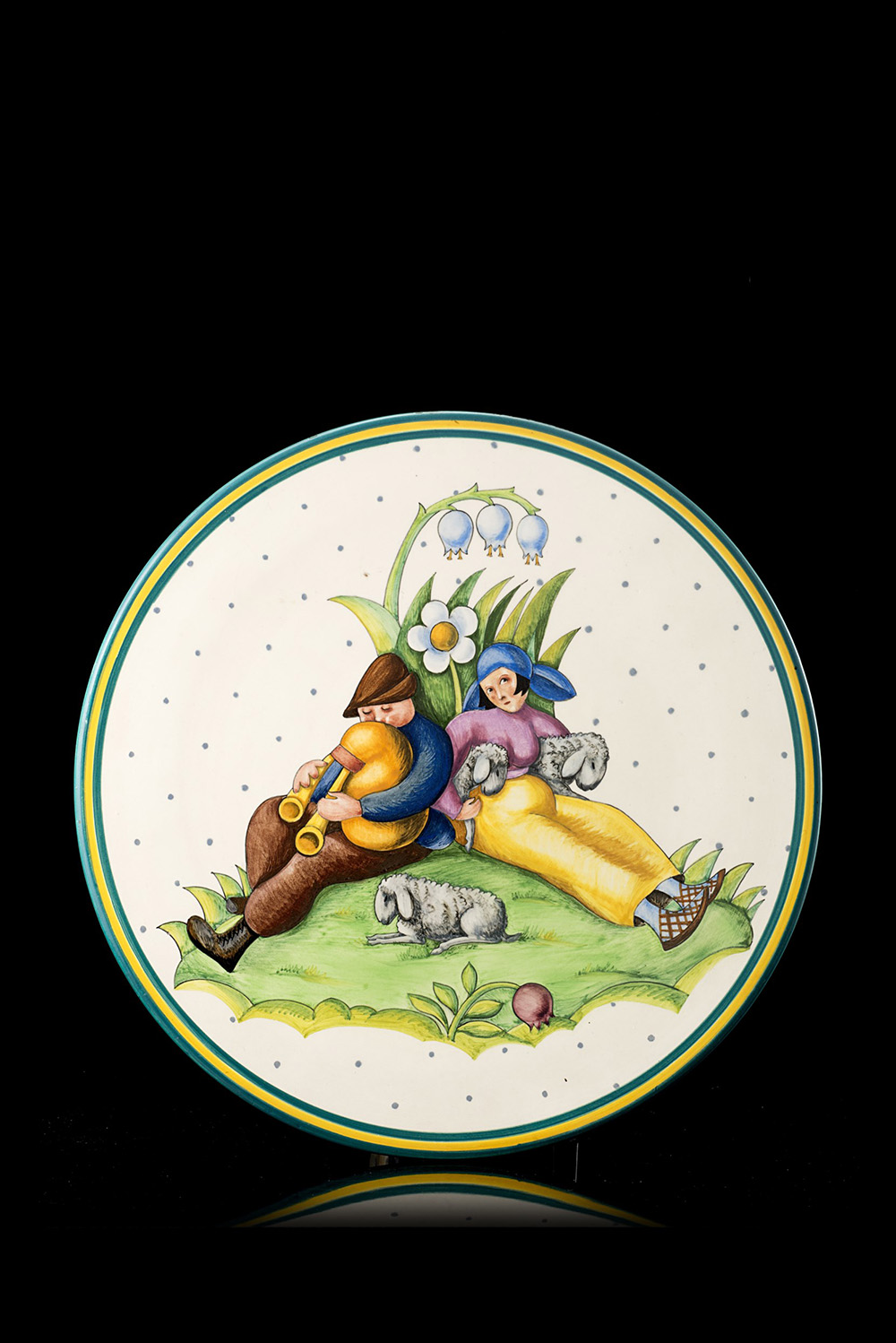 Ceramica formata a colaggio e smaltata opaca in policromia. Manifattura Lenci, Torino, 1935. Recante firma al retro "Lenci TORINO MADE IN ITALY A.XIII.II.35" e monogramma del decoratore. (d cm 32,5) (lievi difetti)